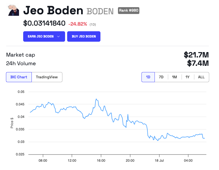 The impact of President Biden’s diagnosis extended into the crypto market, particularly affecting the Biden-themed meme coin, ‘Jeo Boden’ (BODEN). In the past 24 hours, BODEN’s value plummeted by nearly 25%. This downturn in value mirrors the broader uncertainties now overshadowing his re-election efforts.