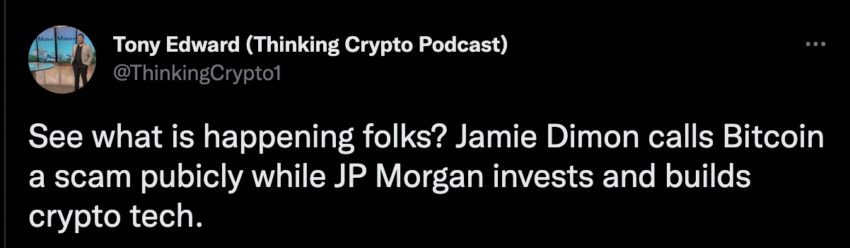 He has often called Bitcoin worthless, a fraud, a terrible store of value, fool’s gold, etc. Most recently, Daniel Pinto, the President of JP Morgan, called crypto irrelevant.