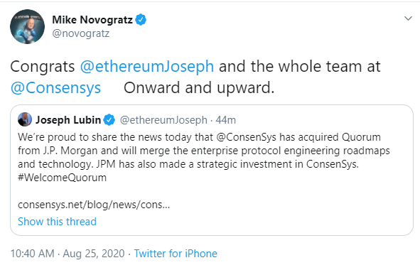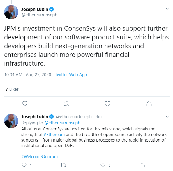 ConsenSys founder Joseph Lubin explained on Twitter that the product roadmaps of its “mainnet-compatible client, Hyperledger Besu,” will converge with that of JPMorgan’s Quorum. He also touted greater “convergence of startups and large orgs on mainnet”, adding: