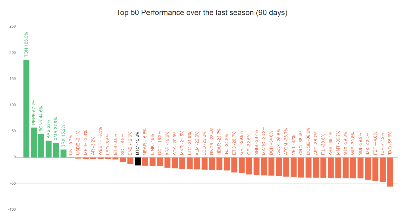 The only altcoins in the green that are doing better than Bitcoin are Toncoin (TON), PEPE, BONK, Kaspa (KAS), Monero (XMR), and Tron (TRX). All other tokens are noting losses.