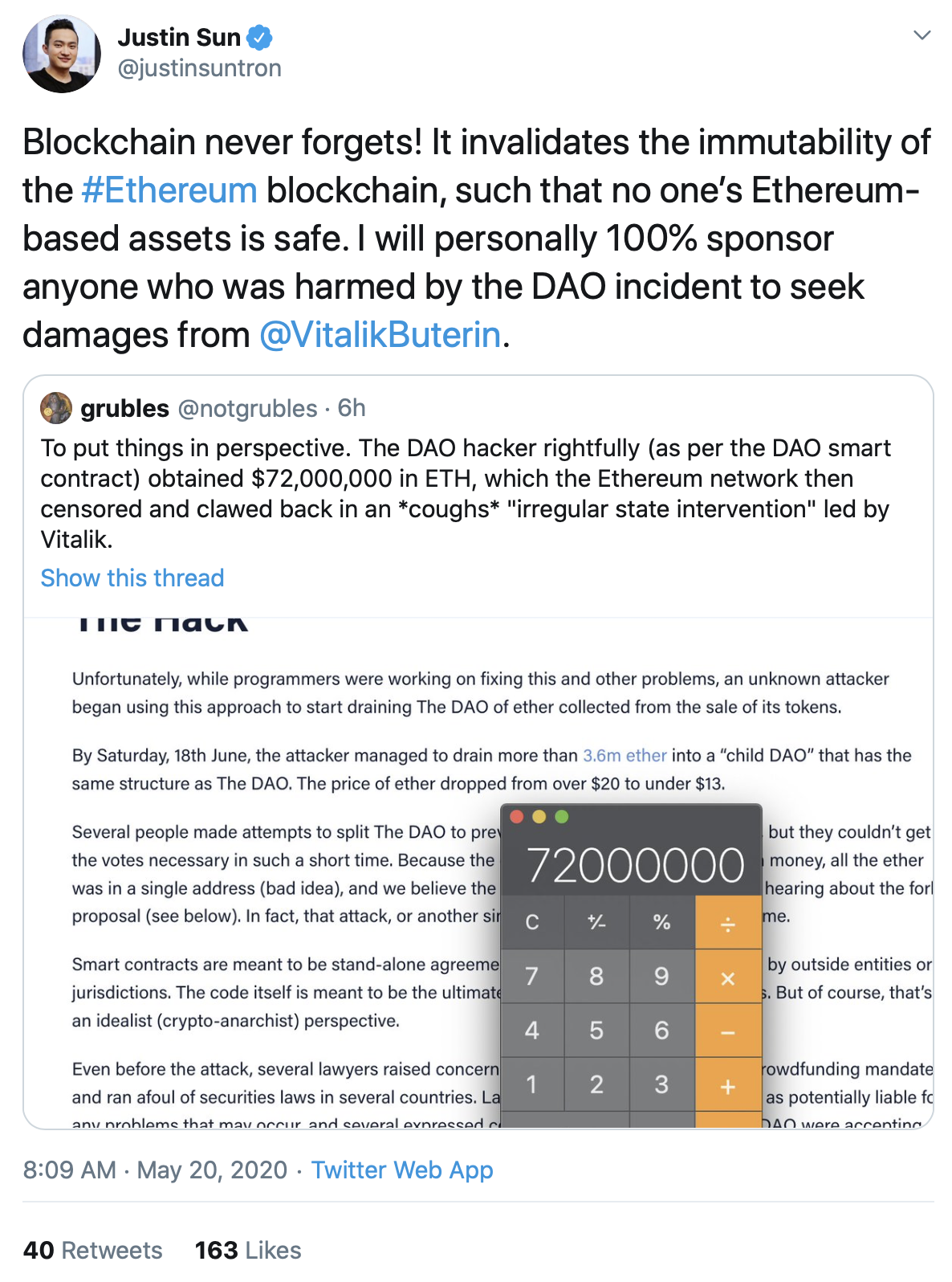 The 2016 DAO hack is a seminal moment in Ethereum’s history, and there are valid points on many sides. However, Sun recently decided to dig up these controversies on Twitter. “Blockchain never forgets!” he writes, arguing that the moment forever ruined Ethereum’s immutability.