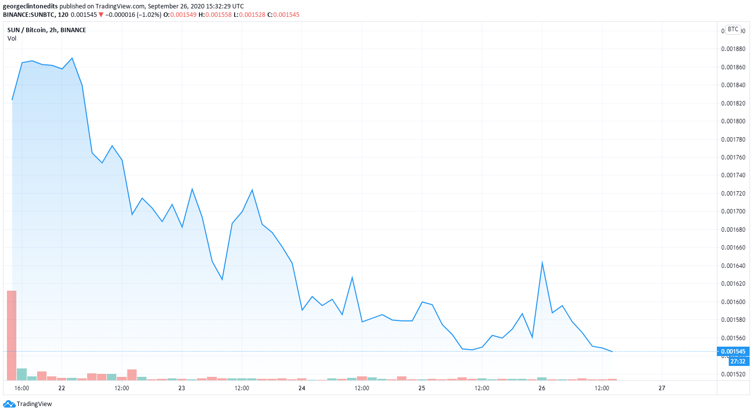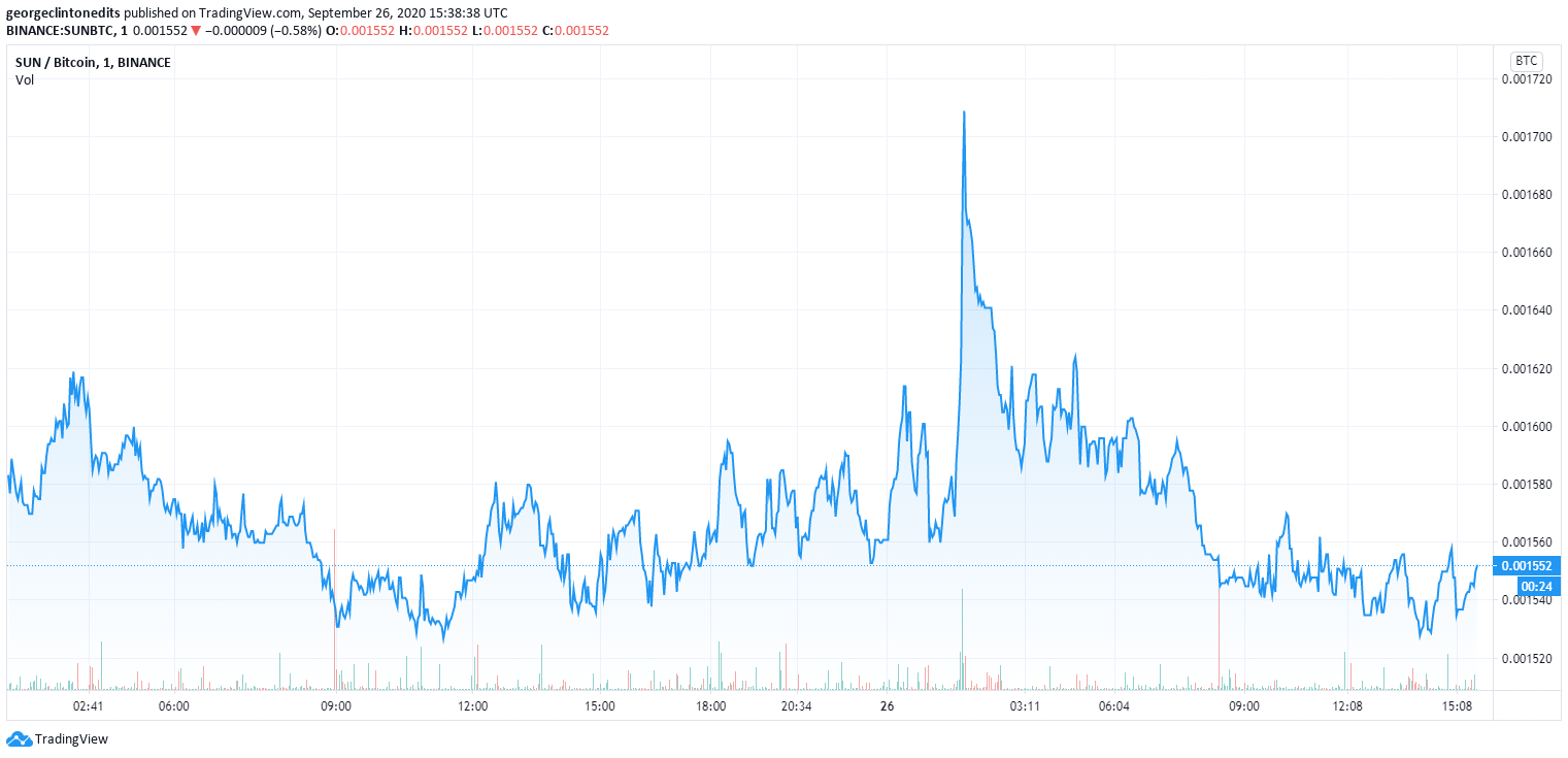 As BeInCrypto reported at the launch of SUN, there is the chance that SUN exists merely for riding the wave of DeFi popularity. TRX’s price is up about 10 satoshis from Sept. 25.