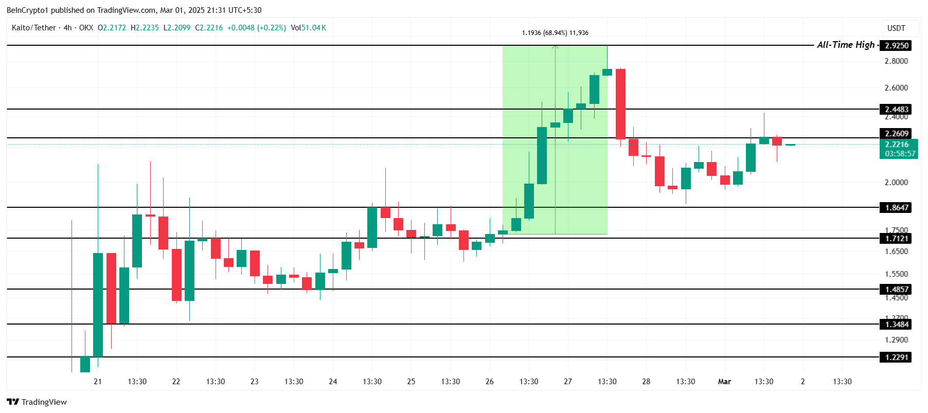 A successful breach of $2.44 would indicate the possibility of a rally, with the potential for KAITO to break its ATH of $2.92 and reach above $3.00.