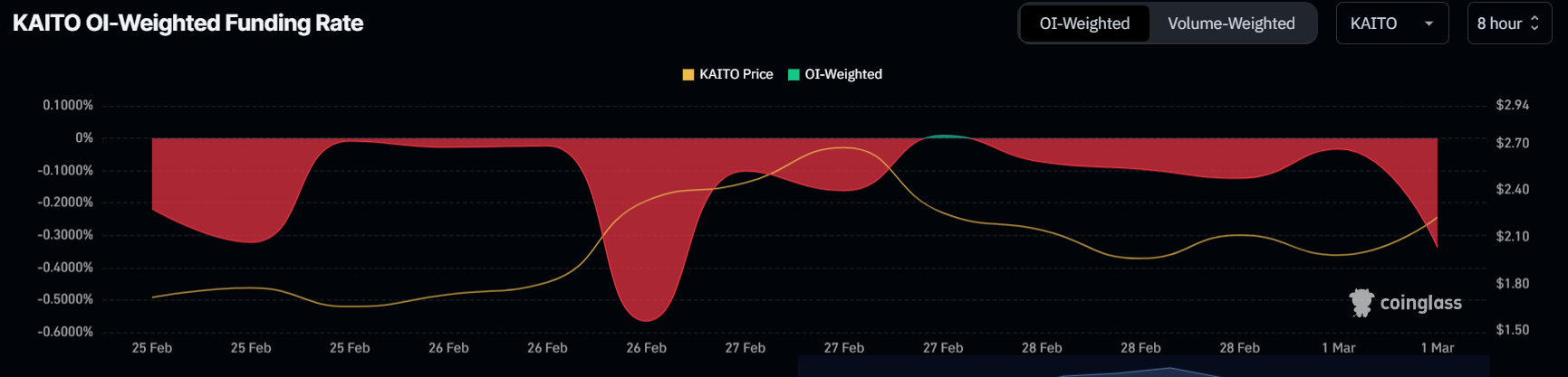 However, despite this potential for upward momentum, traders are still skeptical. The negative funding rate of KAITO, which has increased over the past 24 hours, reveals that many are betting against the altcoin.