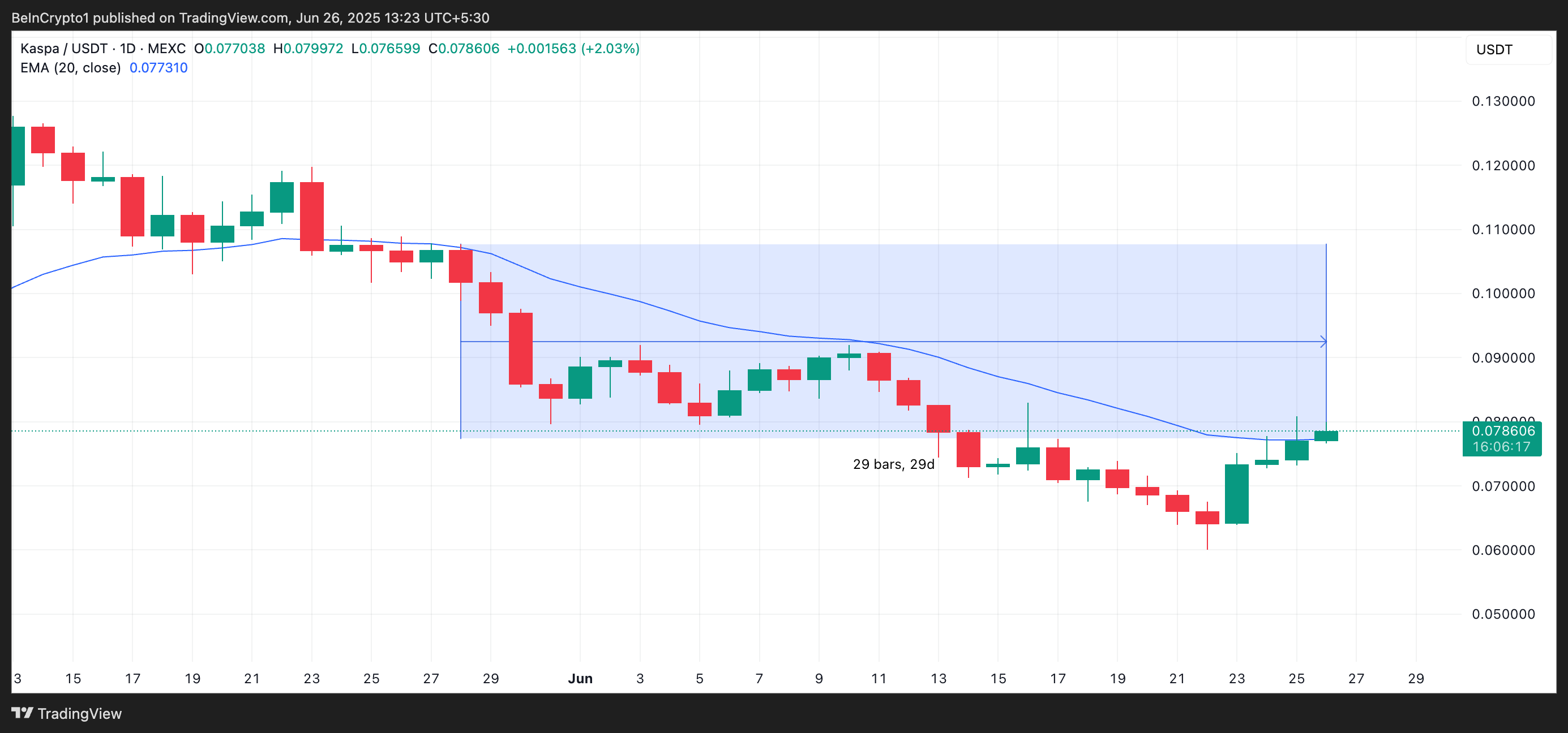Readings from the KAS/USD one-day chart show the altcoin trading above its 20-day exponential moving average (EMA), a resistance level it had struggled to break for the past 29 days.
