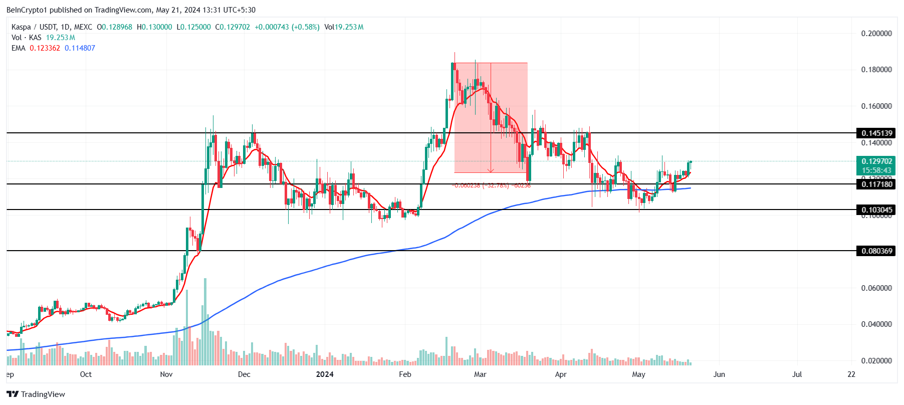 Kaspa’s price is changing hands at $0.13 at the time of writing after escaping the Death Cross earlier this month. A death cross is a bearish formation that occurs when the long-term 200-day Exponential Moving Average (EMA) crosses over the short-term 50-day EMA. This usually results in correction.
