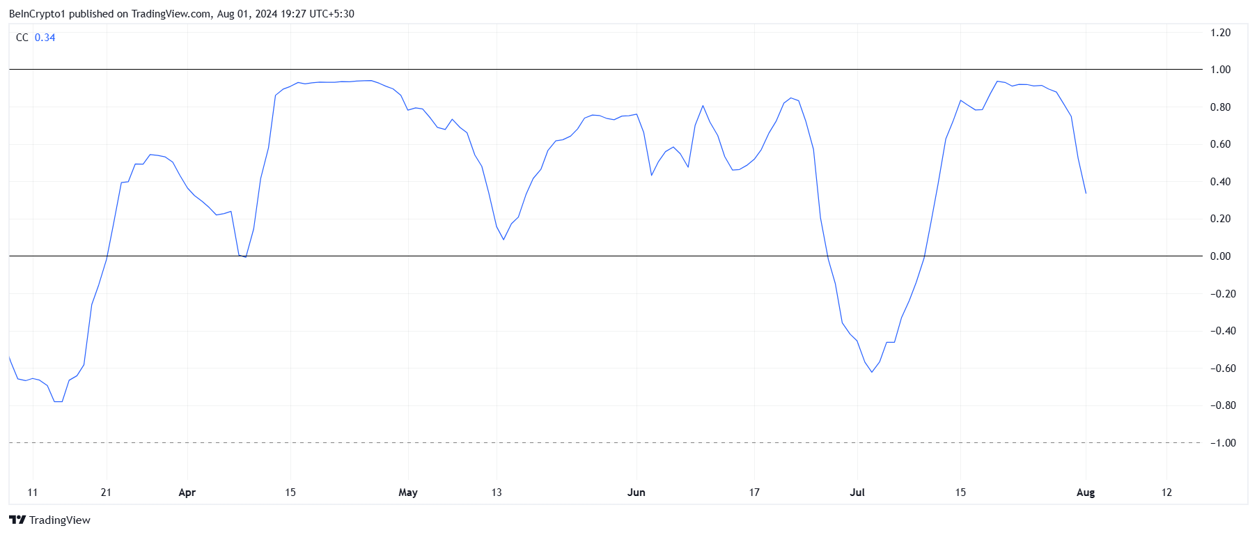 In addition to this, in the last seven days, while Bitcoin’s price dropped below $65,000, KAS managed to post a 16.5% rise. A huge reason behind this is the declining correlation Kaspa shares with BTC.