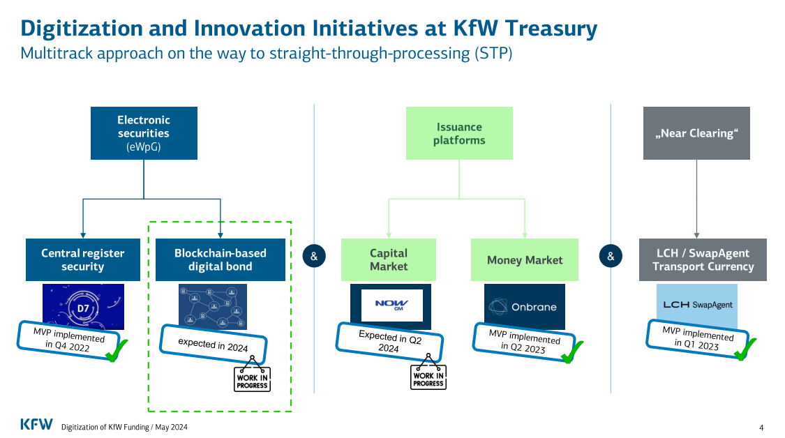 KfW’s journey into digitalization began in 2022, starting with its money market and derivatives. The bank is now advancing to blockchain technology after successfully issuing a digital bond as central register security.