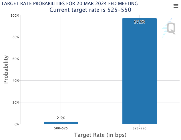 The CME Group’s FedWatch tool disagrees with Summers. It still holds the probability of a March rate pause at 97.5%.