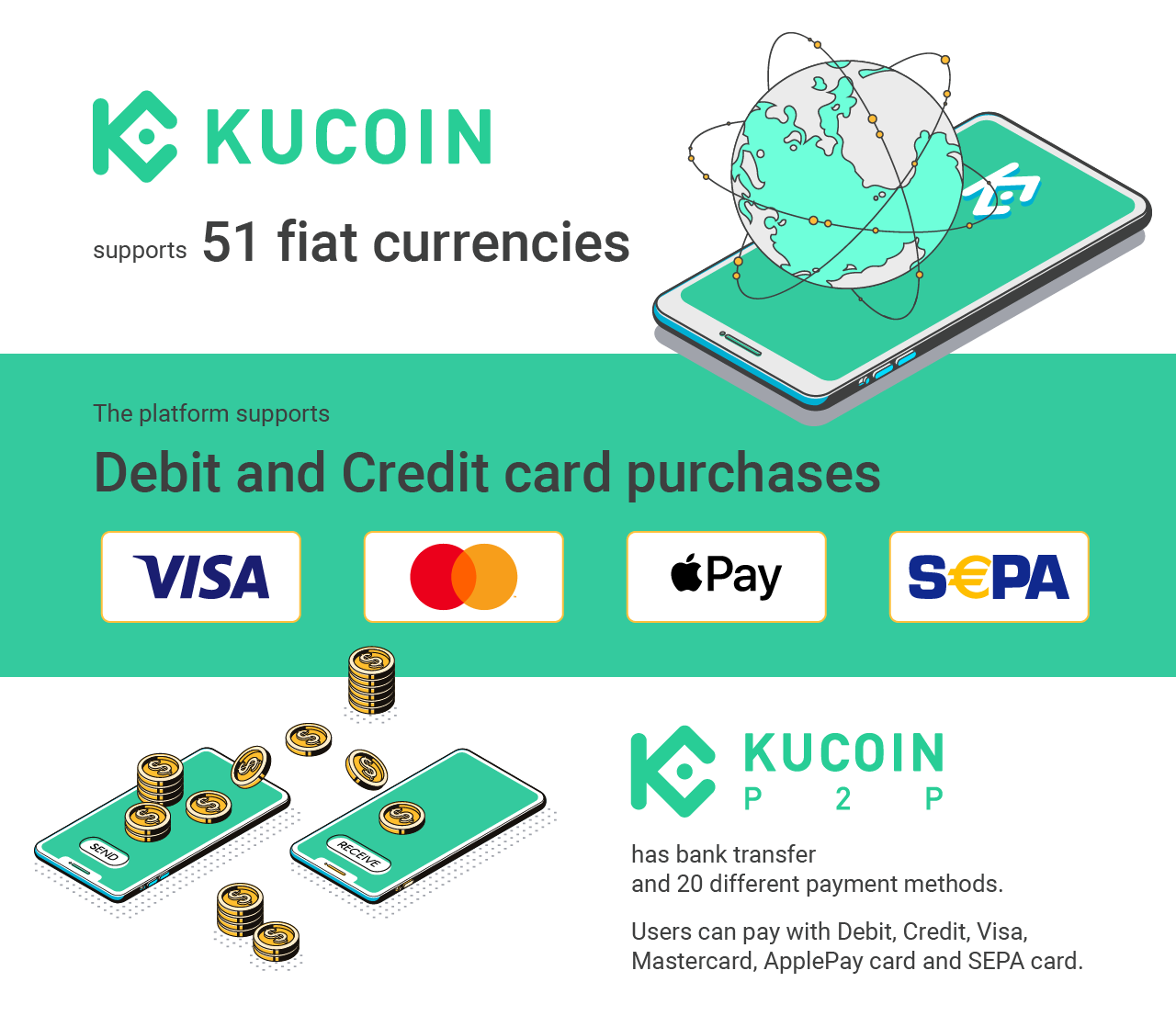 - Wide range of payment options: KuCoin allows you to buy crypto using a debit and credit card (Visa and MasterCard). Other supported payment methods include ApplePay and SEPA. The KuCoin peer-to-peer exchange also supports bank transfer along with 20 different payment methods.