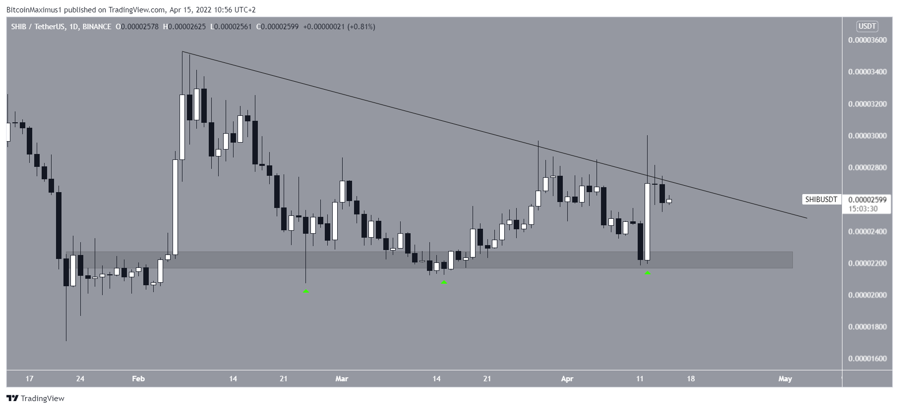 SHIB has been decreasing alongside a descending resistance line since Feb 8. The ensuing drop served to validate the $0.000022 area thrice (green icon). The most recent bounce occurred on April 12.