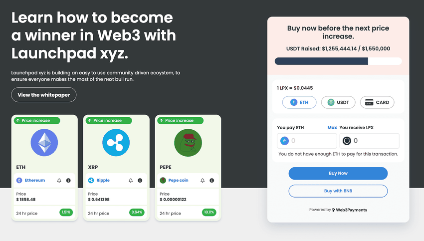 The presale can only be accessed through Launchpad XYZ’s website, where investors can use $ETH, $BNB, or a credit card to purchase $LPX.