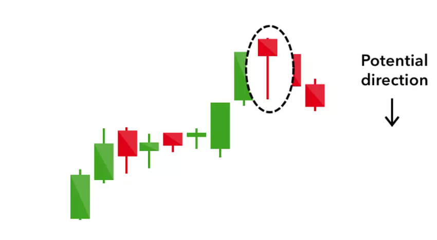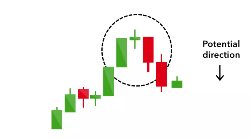 The evening star candlestick is a three-candlestick pattern and represents a potential downward direction. It comprises a short candle that is sandwiched between a long green candle and a long red candlestick.