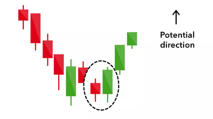 This pattern is formed of two candlesticks; one is a short red body, and the next one is a larger green candle. This pattern shows an upcoming upward direction.