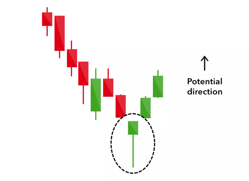 Hammer candlestick is formed of a short body with a long lower wick and is found at the bottom of a downward trend.