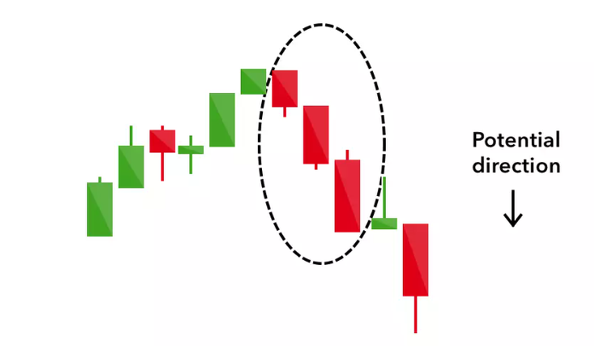 This pattern comprises three consecutive long red candles. Each candle opens at a similar price to the previous one, however, due to selling pressure, their price moves lower and lower with each close. This pattern represents the start of a bearish downtrend.