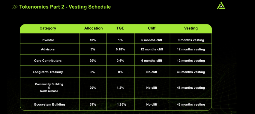 - Vesting schedule: 1% at Token Generation Event (TGE), with a six-month cliff and nine-month vesting period.