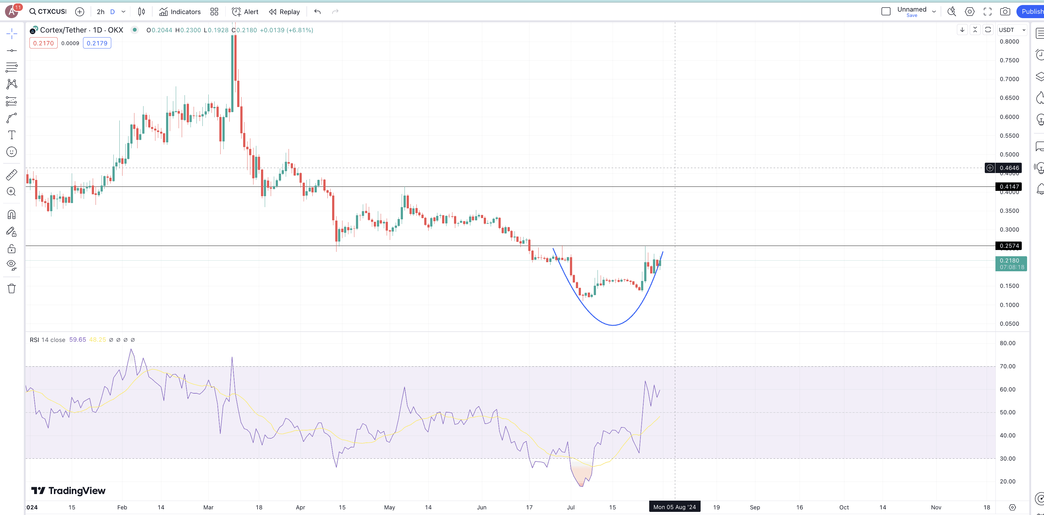 As of July 2024, CTXC is trading at $0.2179, forming a clear cup. The prices have steadied, aligning with the handle formation. A move past $0.2574 can lead to an uptrend and might end up priming the prices for $0.41 and beyond.