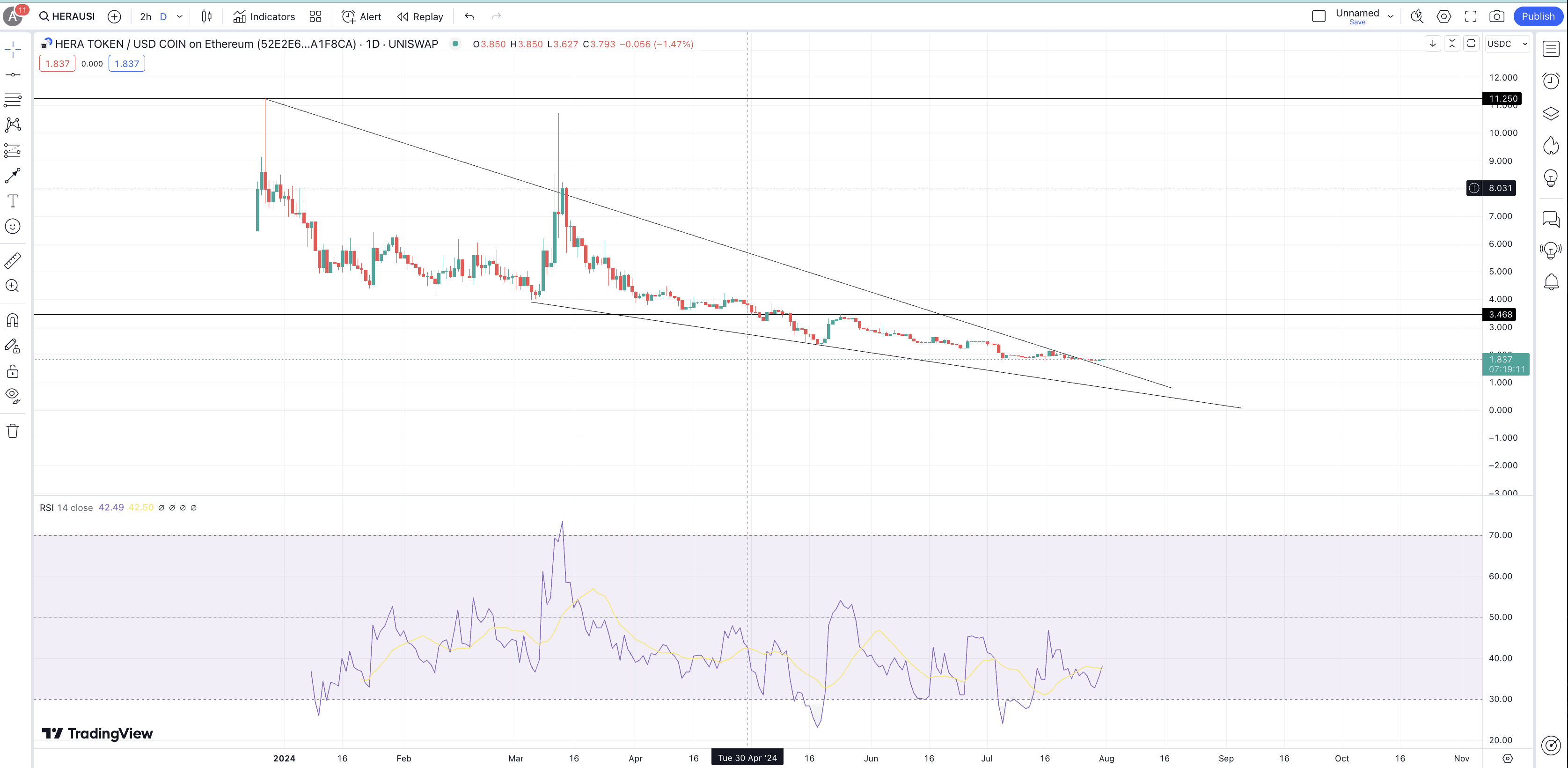 HERA has been in a downtrend since its trading inception. As of July 2024, it is trading at $1.87 and inside a falling wedge. However, it seems that bulls are trying to make it breach past the upper trendline.