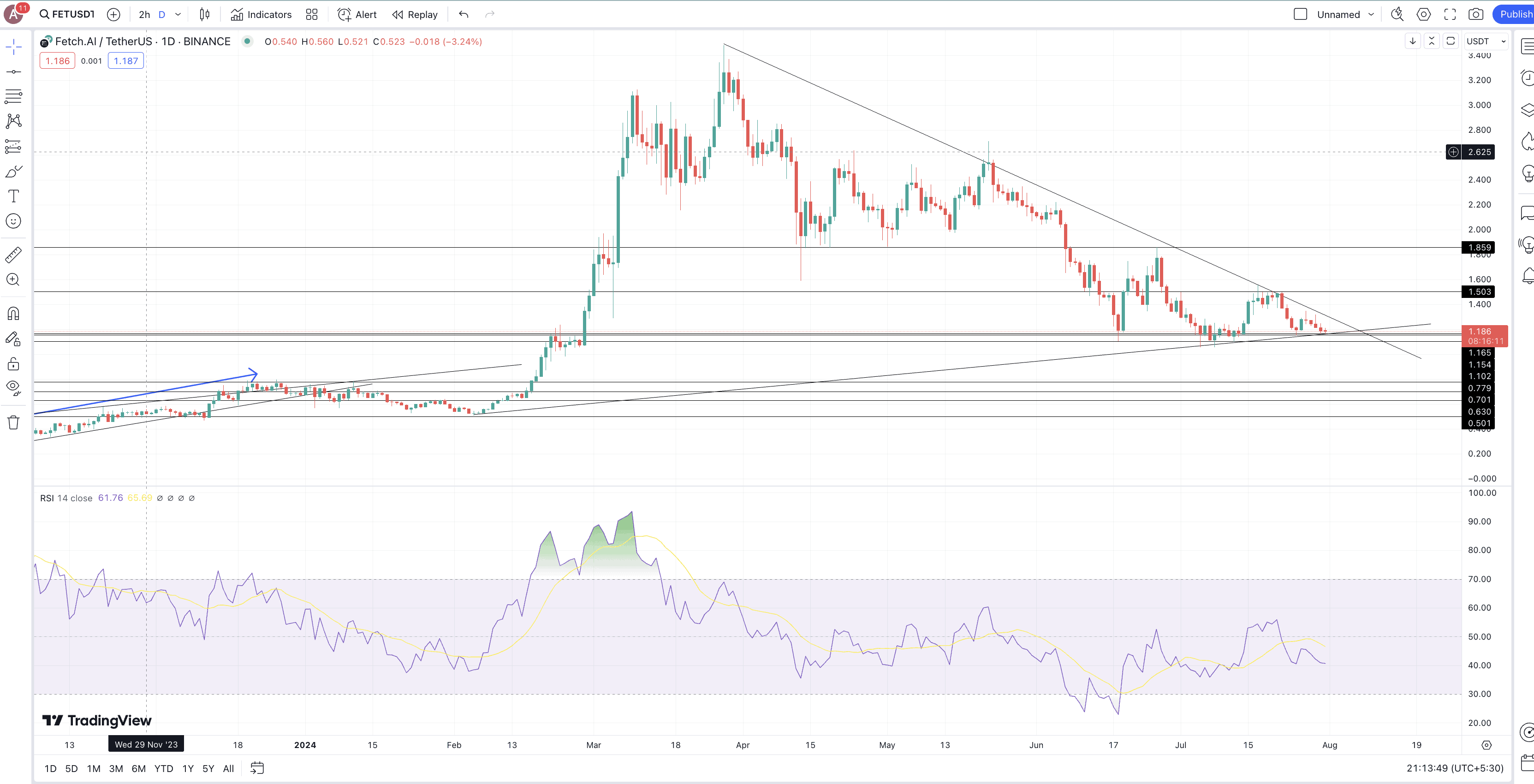 As of July end 2024, FET seems to be trading inside a pennant pattern, closer to the lower trendline. Do note that if the $1.15 level is breached, it might even push the crypto lower, all the way to $1.10.