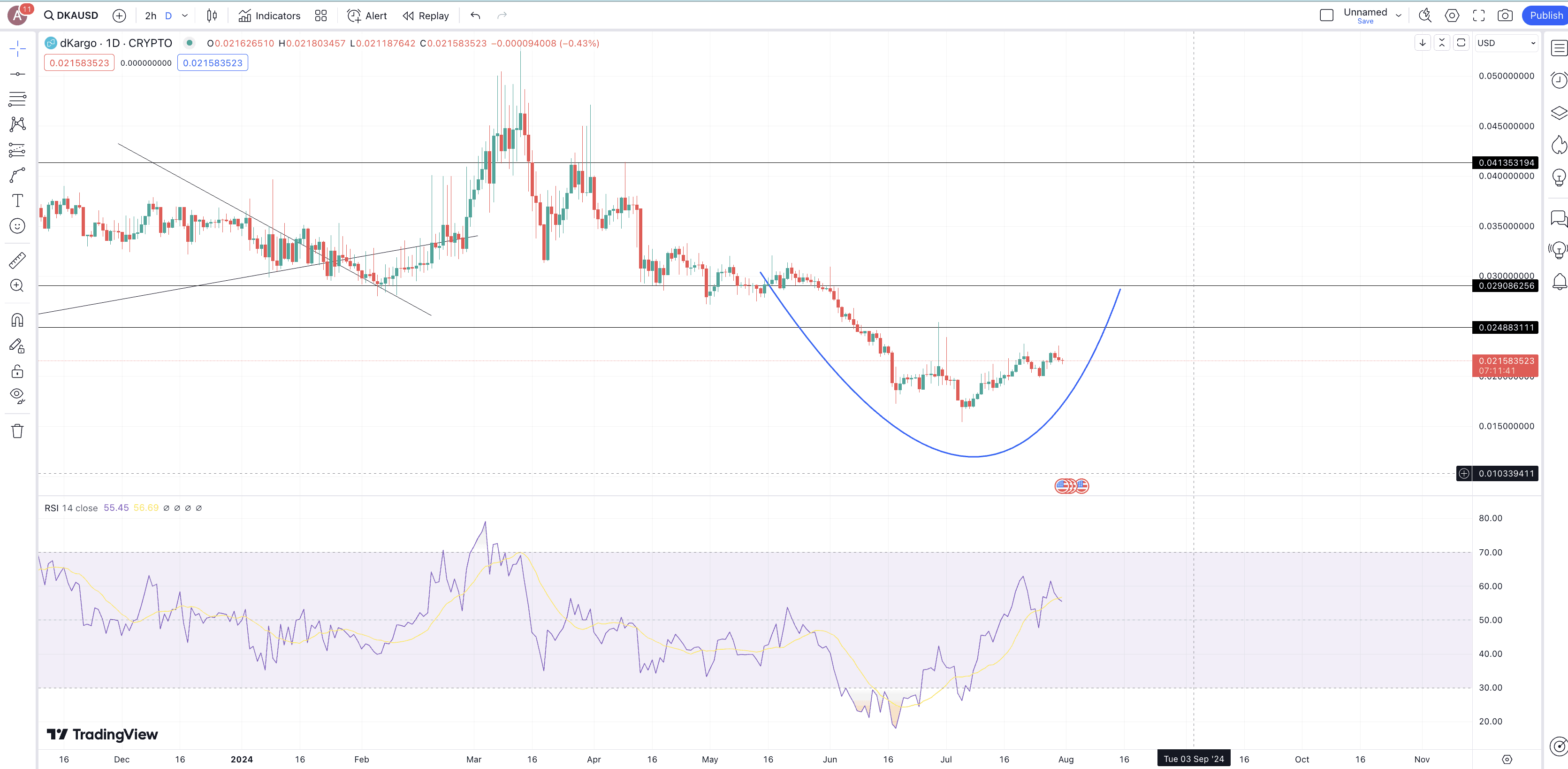 dKargo’s price chart is hinting at a revival. DKA is trying to complete a cup, with key levels being at $0.02488 and $0.029.