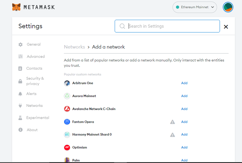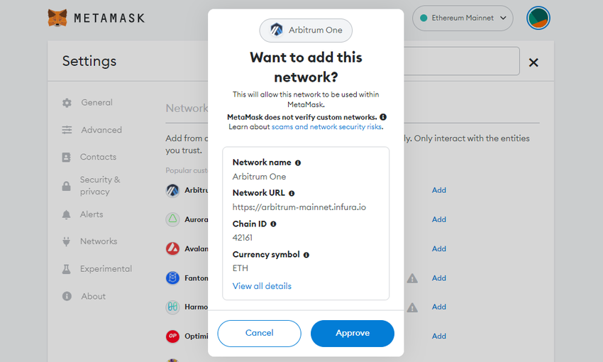 - First, add the Arbitrum One network to MetaMask. To do this, open your wallet and click the drop-down menu at the top. Next to Arbitrum One, click “Add.”
