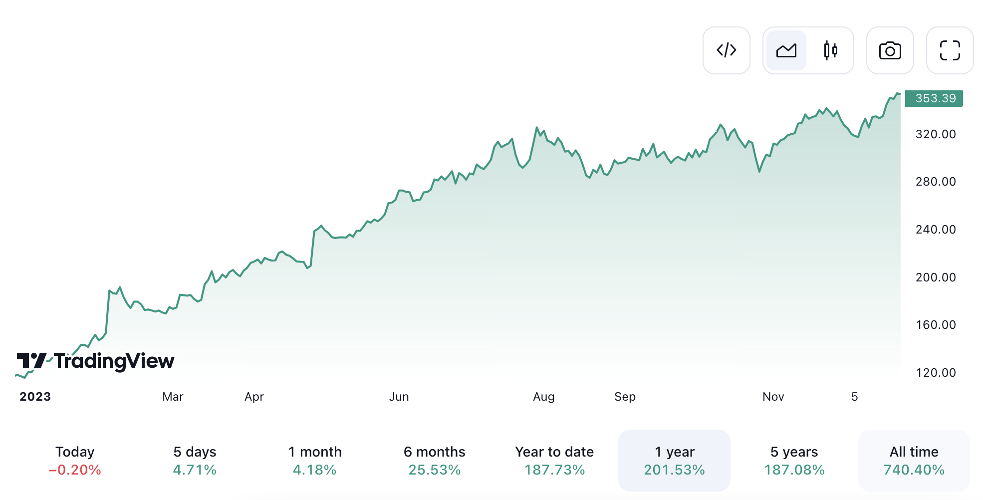 Meta Platforms Inc. (META) has experienced significant gains, with a year-to-date increase of 187.73%. Meta’s performance reflects robust long-term growth, boasting a 740.40% rise since its inception. The company’s market cap is nearly 910 billion USD, with a PE ratio of 31.16 and EPS of 11.34, while analysts project a 1-year target estimate at 338.84 USD.