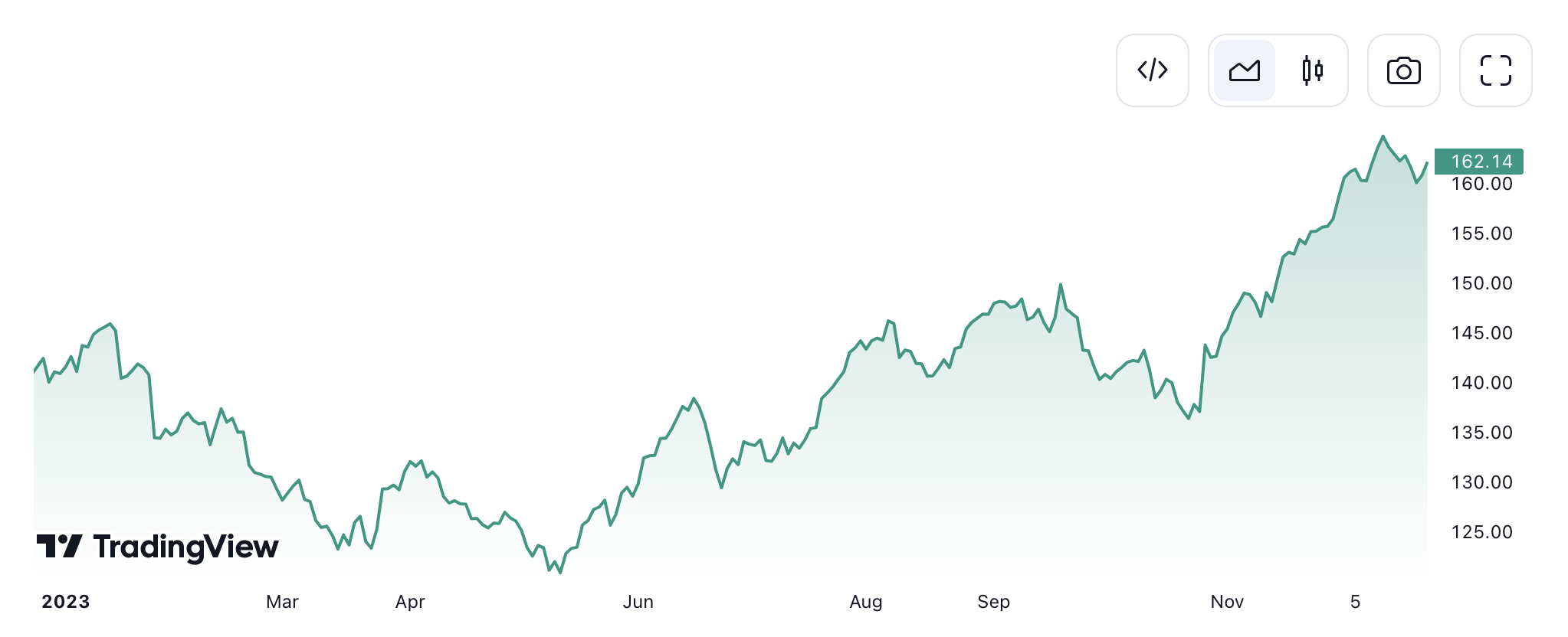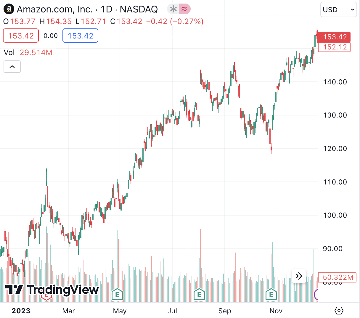 In 2023, Amazon’s stock price consistently ascended, as indicated by the prevalence of green candlesticks on the chart. While red candlesticks show some market volatility, the overall trend was positive, with increased trading volume hinting at growing investor interest. The stock peaked at $153.42, reflecting robust confidence in Amazon’s market performance.