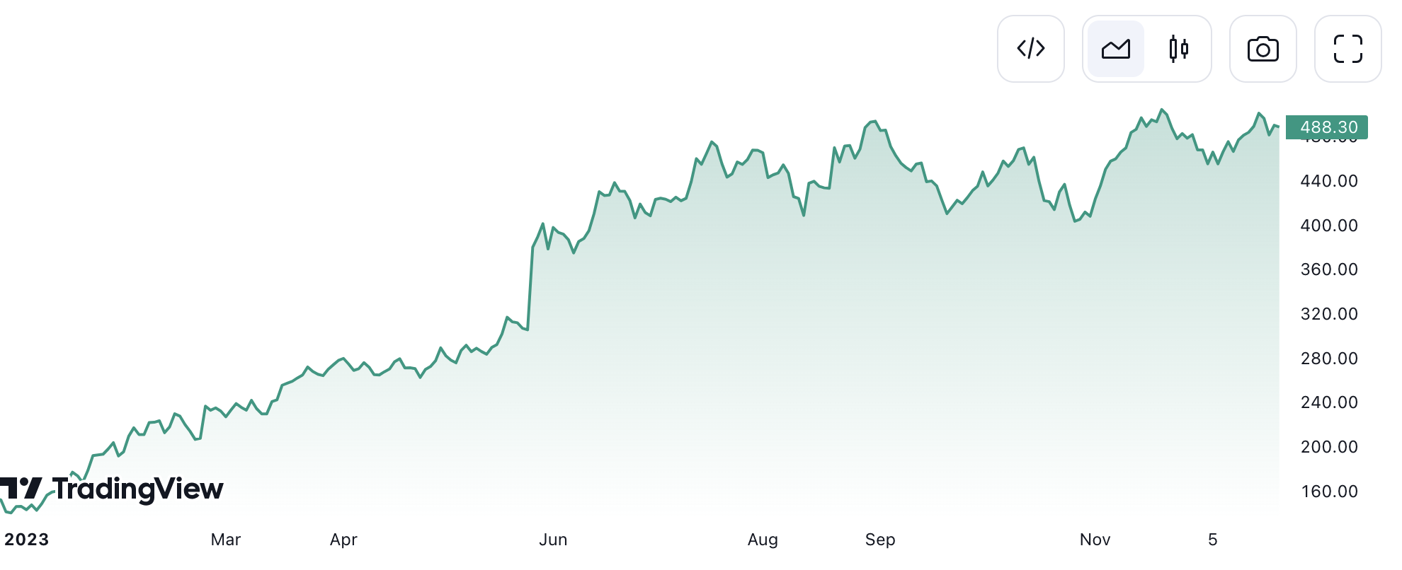 Despite the usual market fluctuations, the overall trend remains positive, culminating in a price of $488.30 by early December 2023. This near doubling in the stock price reflects Nvidia’s strong market performance during this timeframe. Moreover, Nvidia is a graphics chip giant that has heavily invested in the AI market for years.