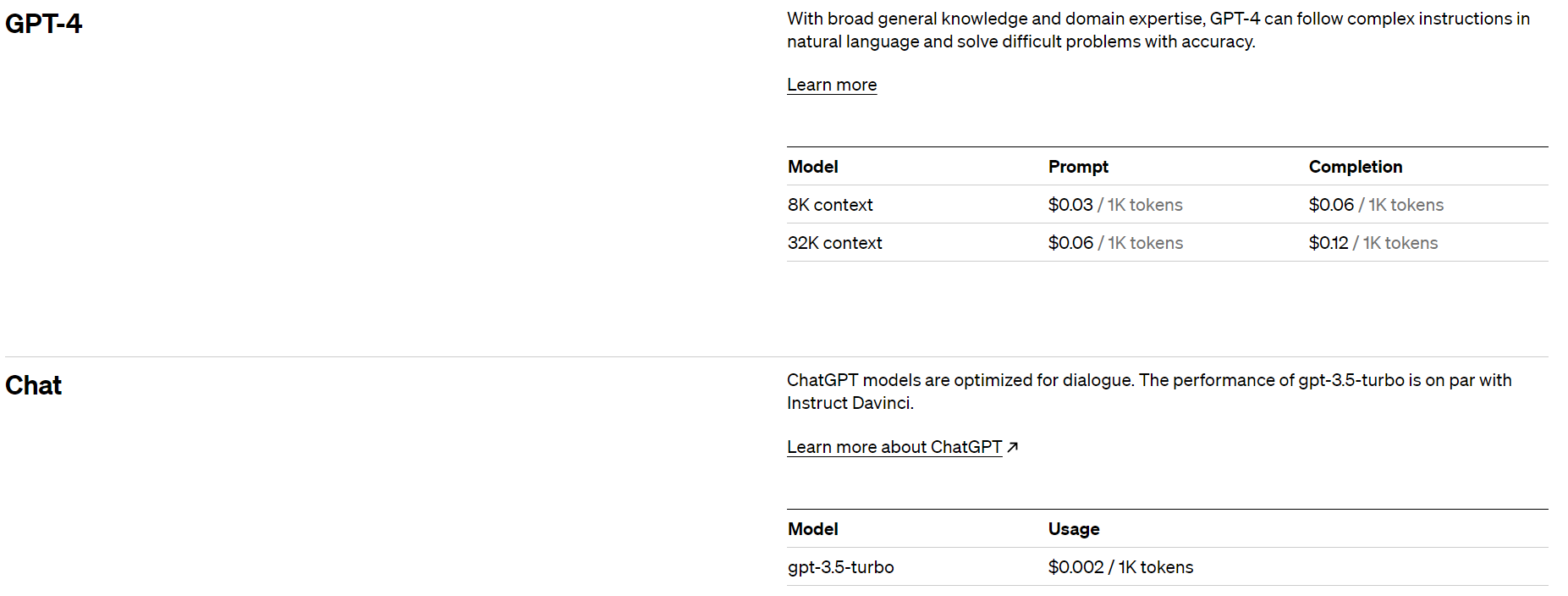 As for the OpenAI APIs, there are two options to choose from as of this writing — one with 8,000 context and the other with 32,000 context. As you can see in the image below, prices depend on the model you choose and can be quite expensive if you’re not careful with it. We’ll discuss these drawbacks in detail later in the guide.