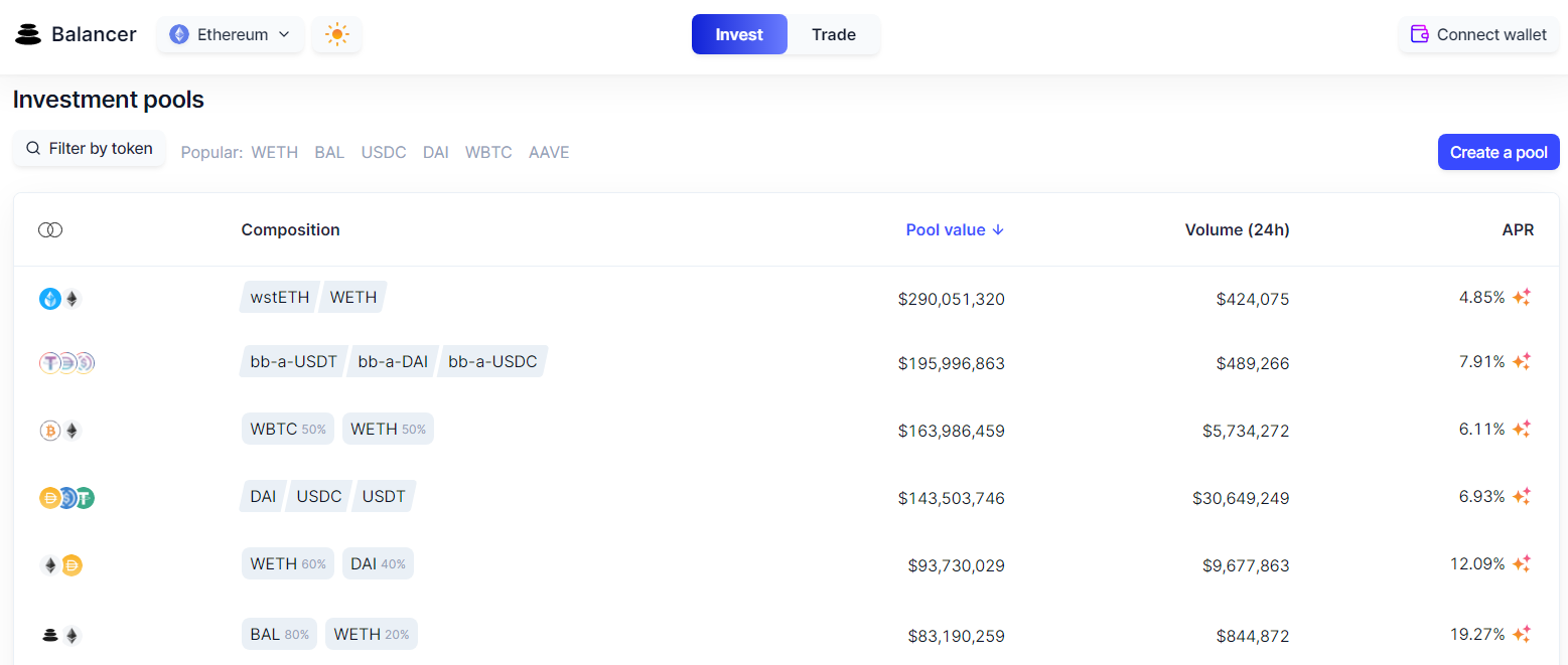 SponsoredThe Balancer exchange was initially distinctive because its protocol could support several assets in a single trading pool, which was not common in the early days of DeFi. Additionally, it has a predetermined trade cost agreed upon by pool creators.