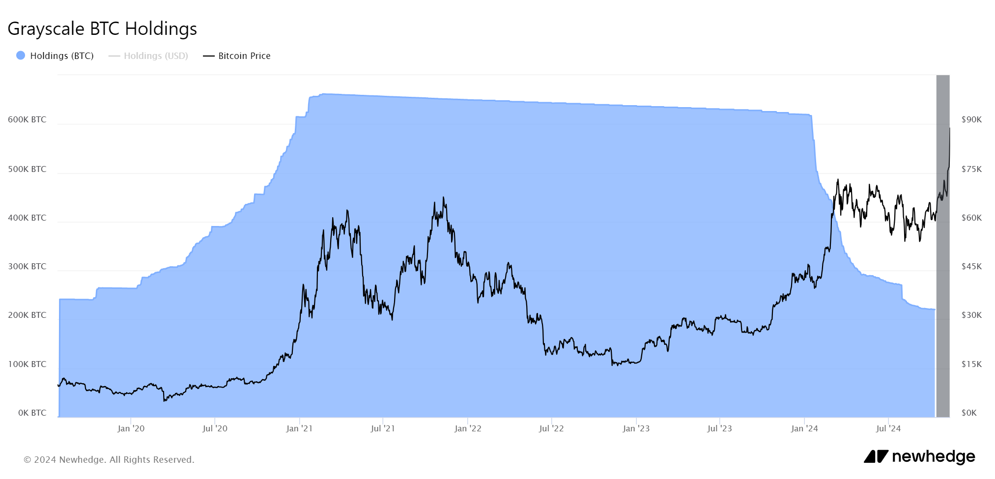 Under the Grayscale Bitcoin Trust (GBTC), the company owned over 600,000 BTC at one point. Following the creation of its spot Bitcoin ETF, the company has seen a massive drop in its reserve due to redemptions.
