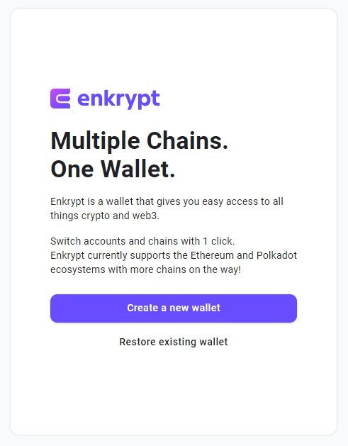 Enkrypt wallet is a browser extension wallet developed by MyEtherWallet (MEW). It’s designed to be compatible with both EVM (Ethereum Virtual Machine) and Substrate-based blockchains. This compatibility allows users to interact seamlessly with Ethereum and other EVM-compatible chains, as well as with Substrate-based chains like Polkadot, Kusama, Acala, and others.