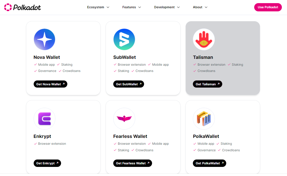 You can get a Polkadot wallet by going to the official Polkadot website and searching for wallets. There are many wallets that accept Polkadot and Substrate blockchains. However, only a few offer ecosystem specific features like staking or voting.