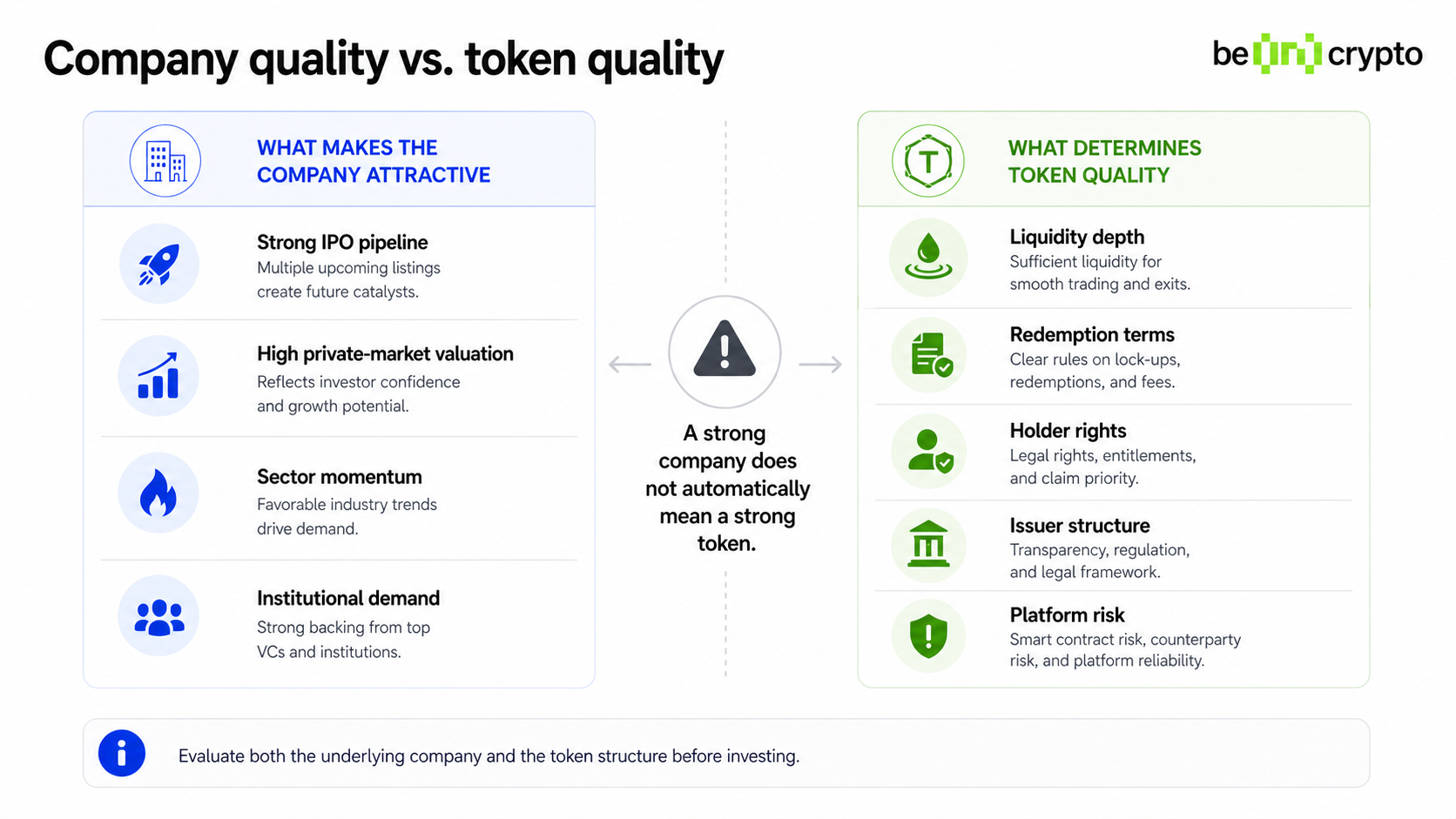 Their prices may move based on how markets perceive the underlying company’s valuation, but these tokens are not official company shares and do not come with shareholder rights. Also, a strong company name on the label does not automatically translate into a strong token. Liquidity, redemption rules, legal rights, issuer structure, and platform risk all play a role in determining what a token is actually worth. The company name is only one part of the picture.