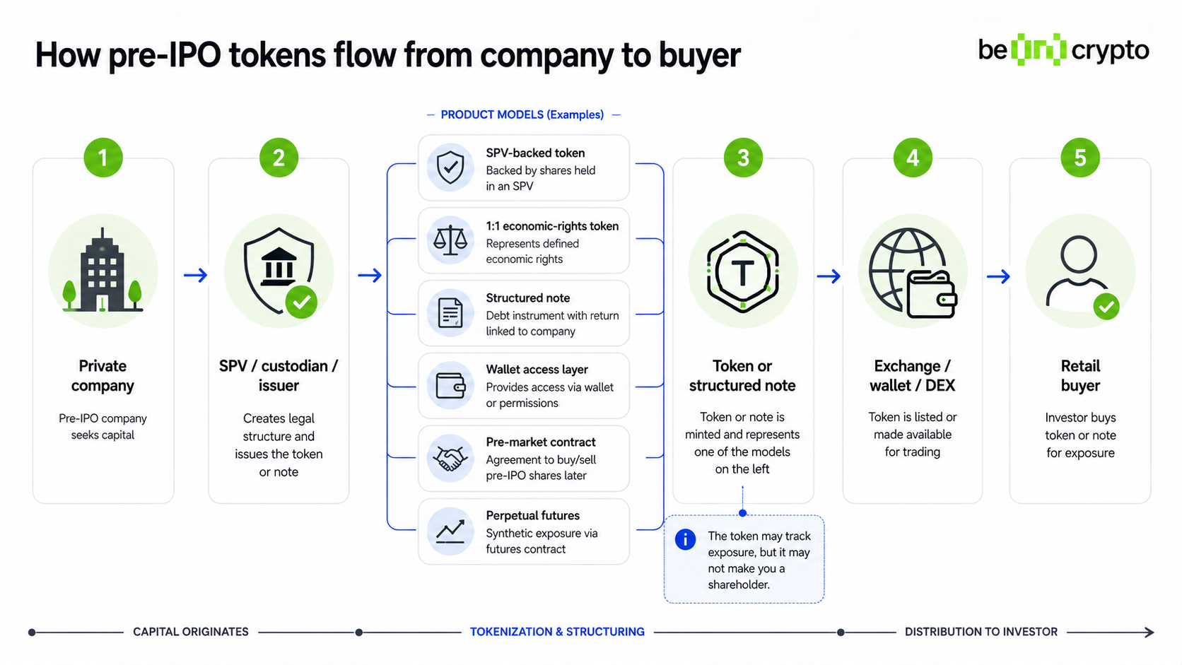Most pre-IPO tokens do not give you direct shares in the referenced company. Instead, they provide economic exposure through an issuer, SPV, structured product, or derivative-style market. That distinction matters, because it affects what you actually own — and what you don’t.
