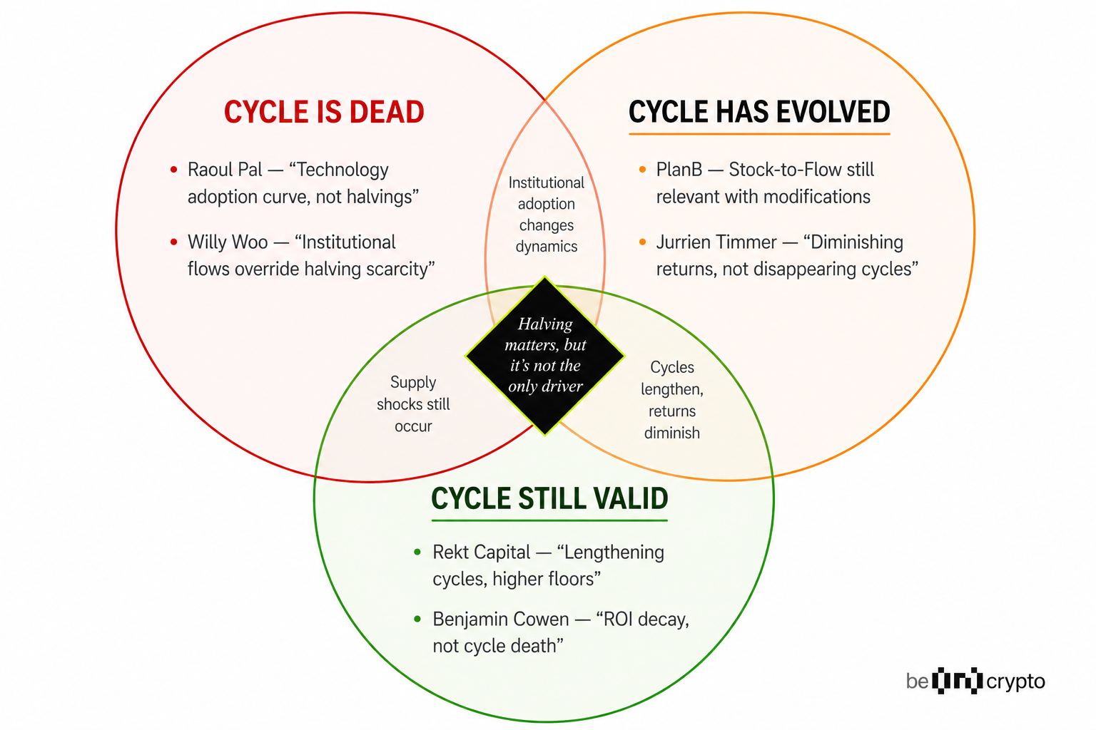 | Cycle evolved | The halving still matters, but macro conditions and flows now matter more | Best synthesis of both camps | It is harder to reduce to a simple trading rule |