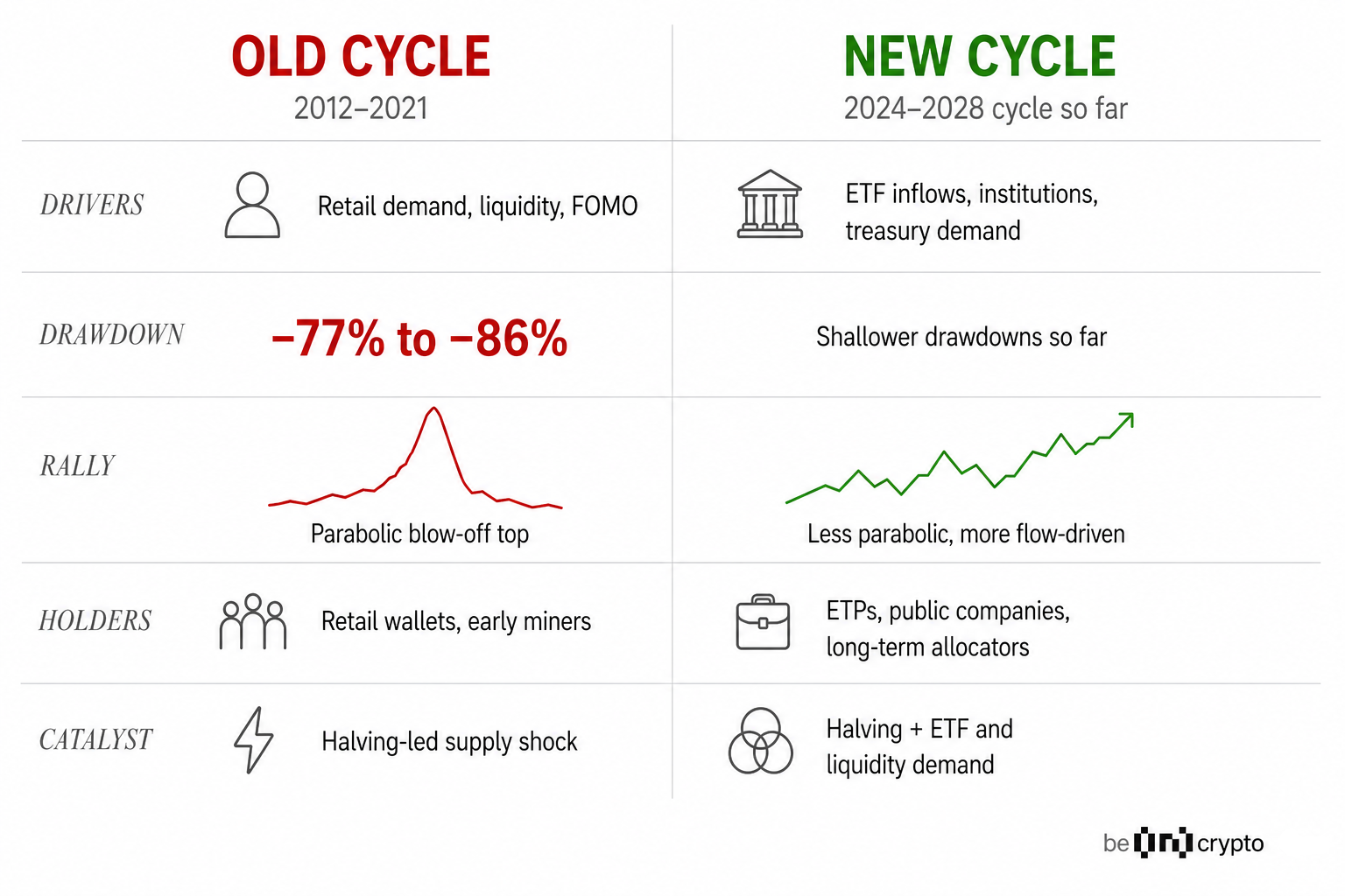 The current Bitcoin cycle looks different because demand arrived earlier, market access changed, and price discovery now depends on more than the halving. Several structural changes separate the 2024-2026 period from every prior cycle, which means the old model alone is no longer enough.