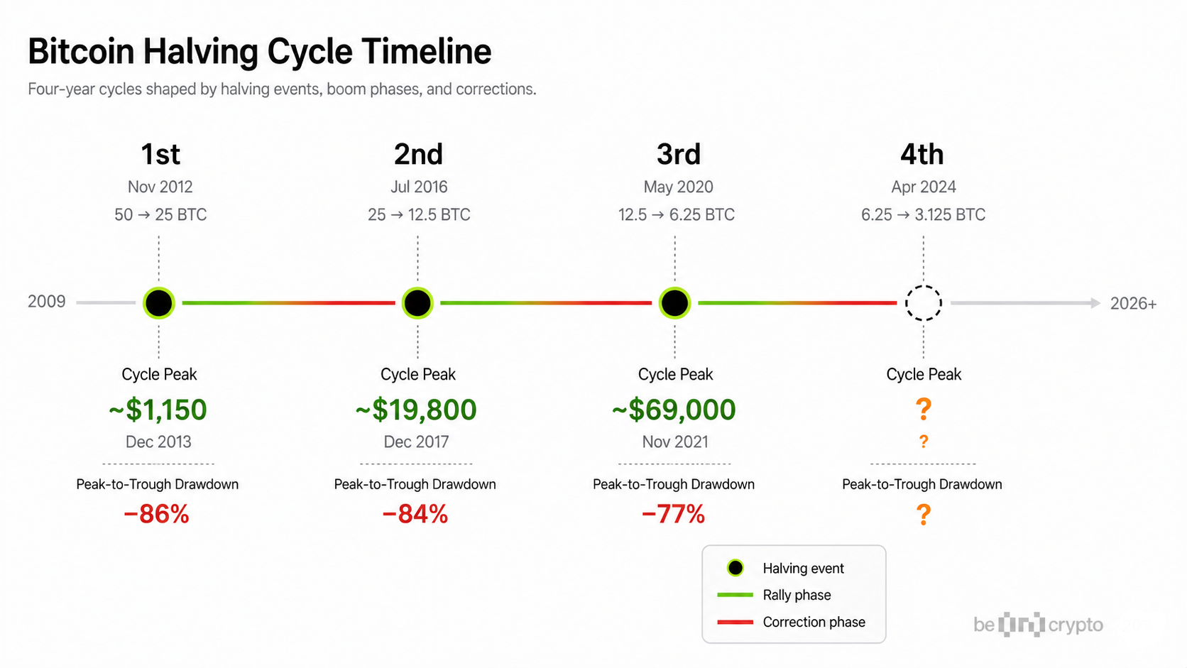 Each of these cycles ended with drawdowns of at least 77% from the peak, according to Fidelity Digital Assets research. The current cycle has started to break that pattern, which is one reason the debate over whether the old model still holds has grown much louder in 2026.