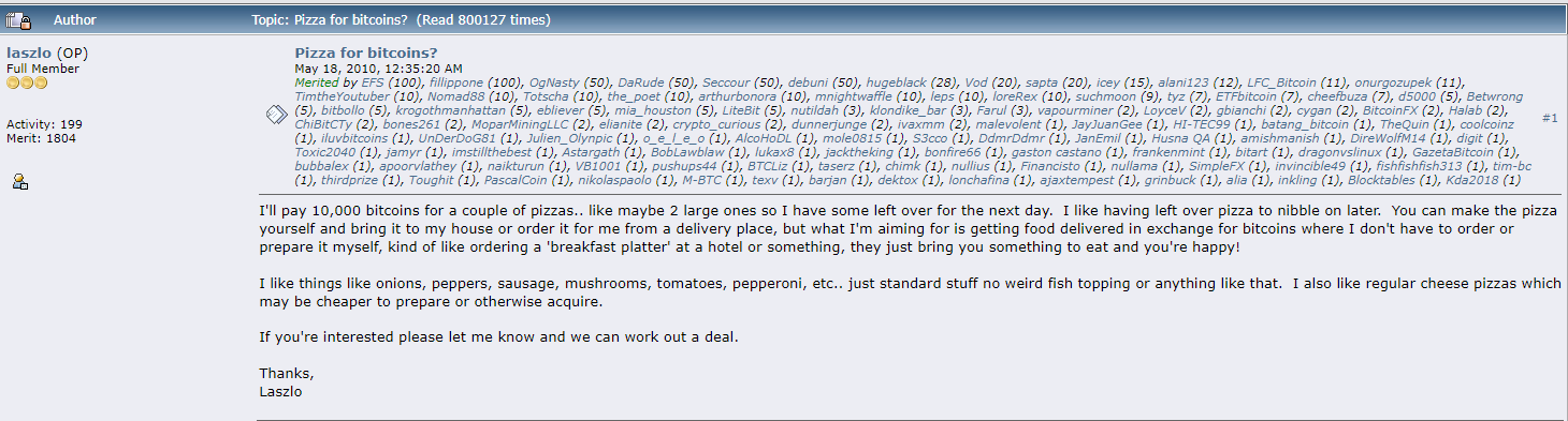 “I’ll pay 10,000 Bitcoins for a couple of pizzas.. like maybe 2 large ones so I have some left over for the next day,” Laszlo Hanyecz wrote.