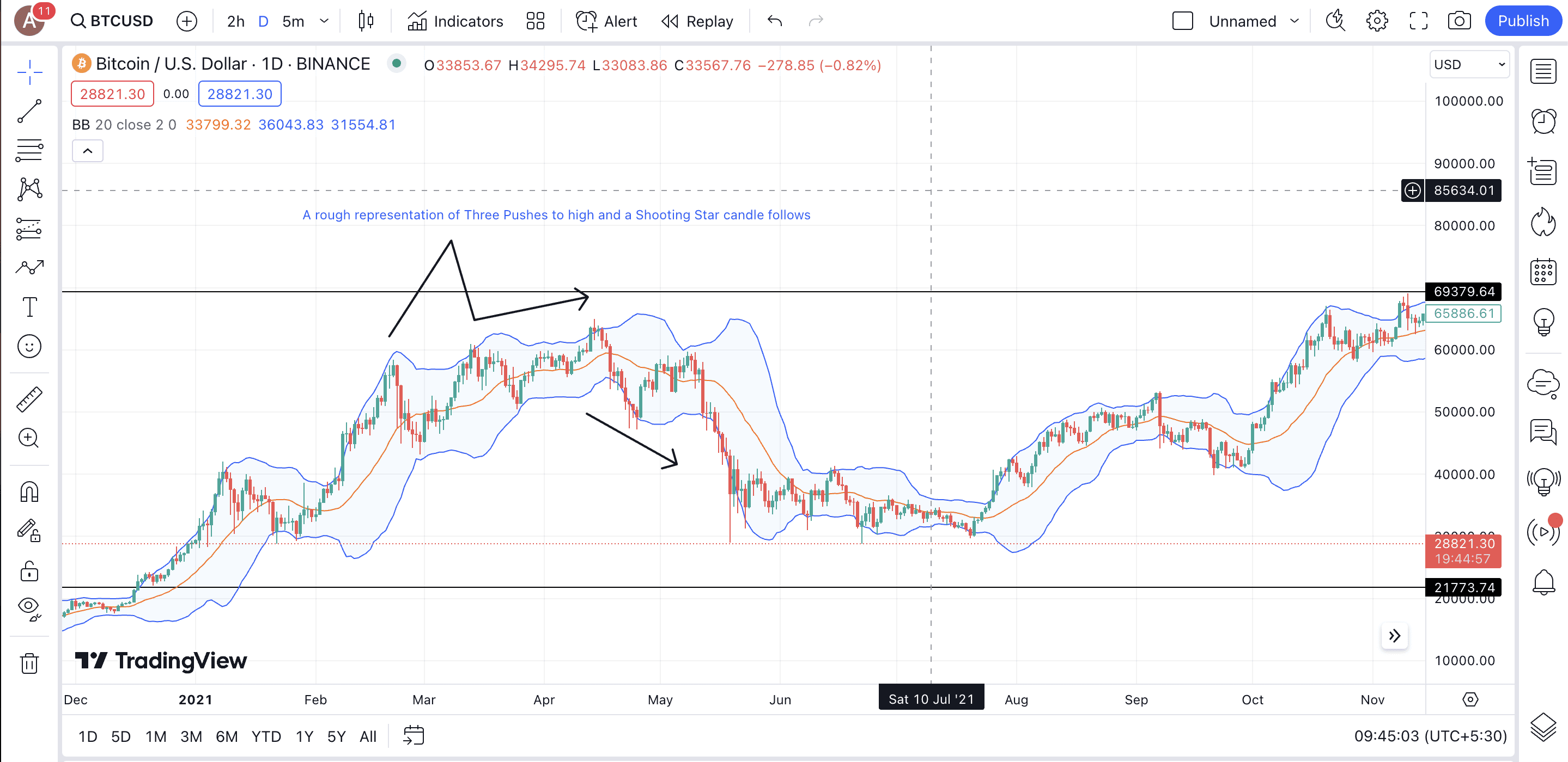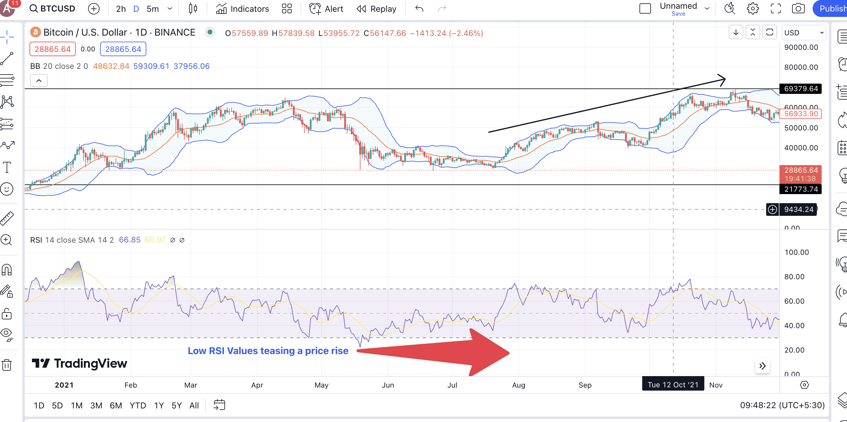 The upper and lower bands are usually charted two standard deviations away from the SMA or the middle line. And while the upper and lower bands show price extremes, the price following the middle band corresponds to it trading in a neutral range for the time being. The Upper-Lower narrative for trading Bitcoin is as follows: