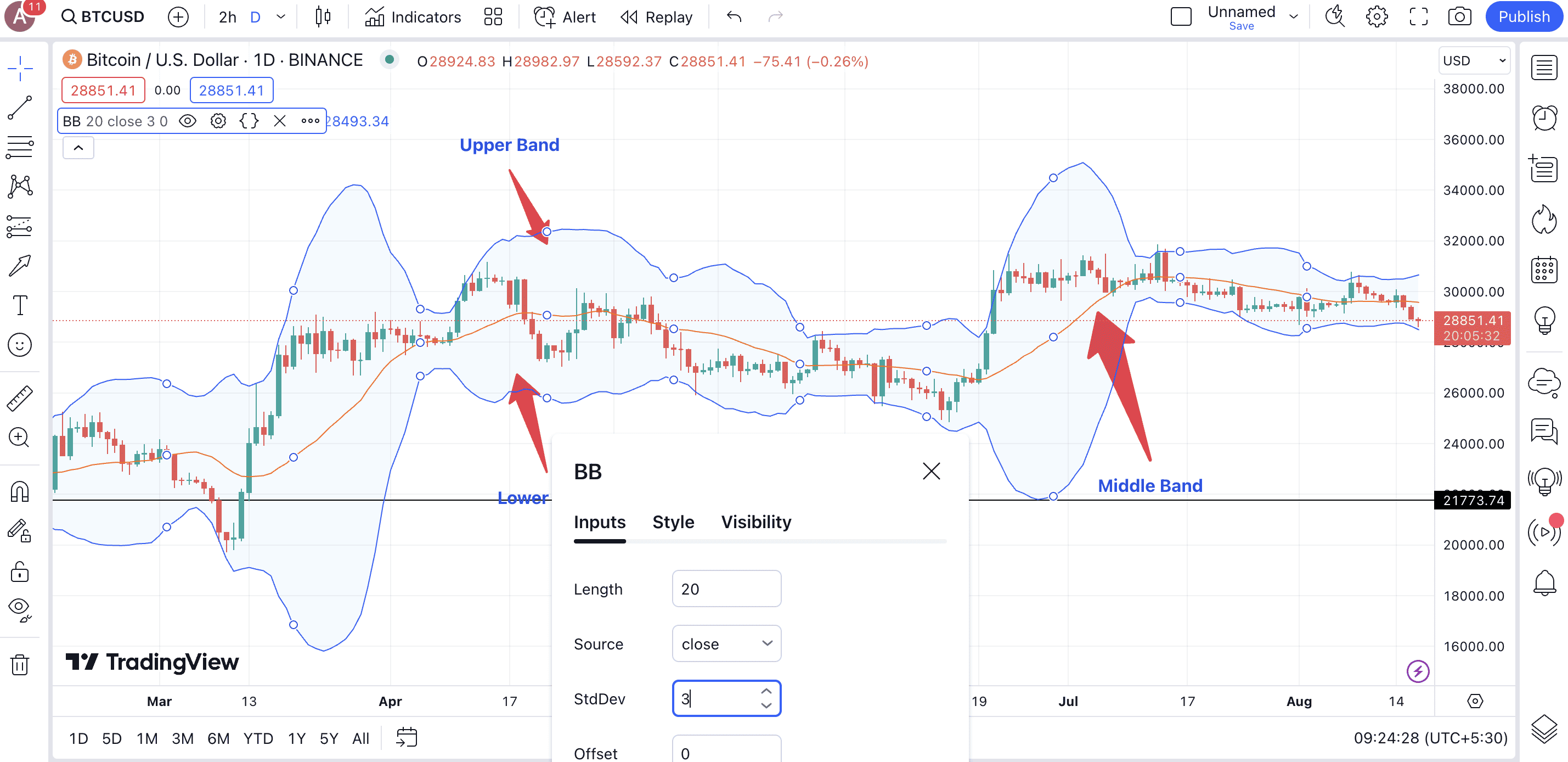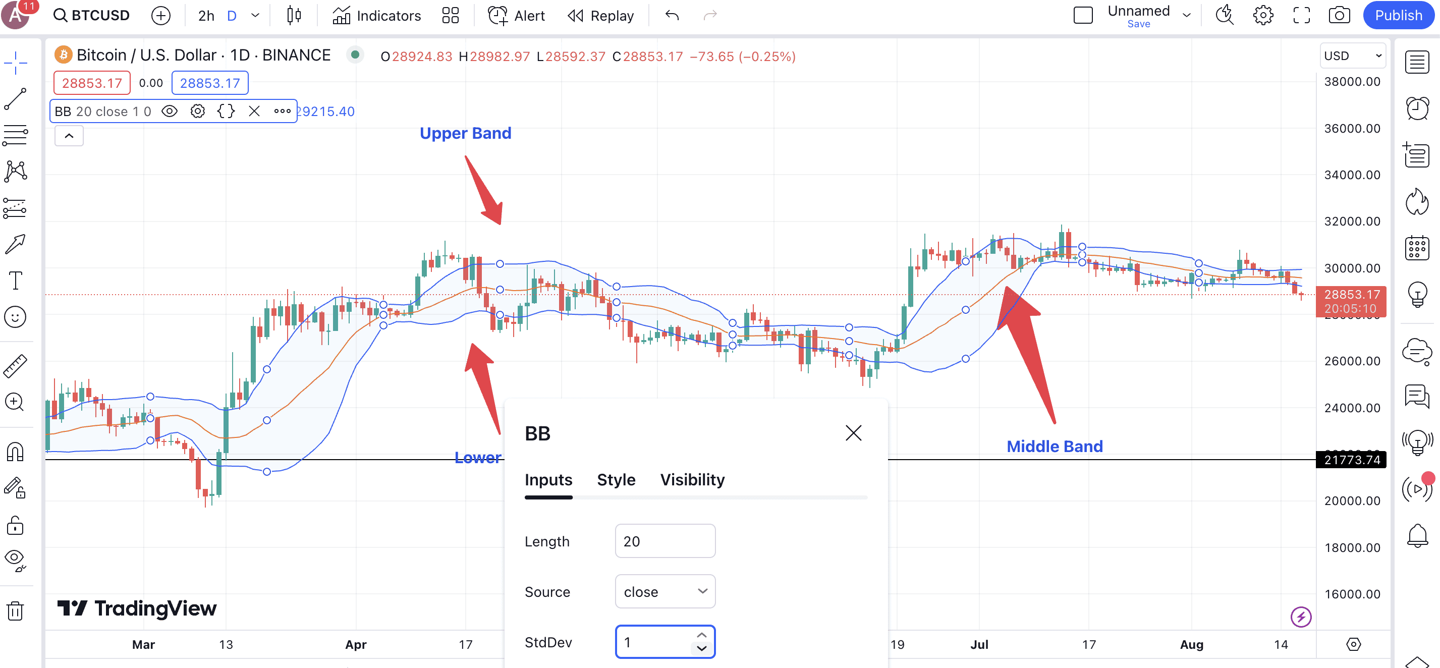 Upper Band = Middle Band + (Number of Standard Deviations x SD of Price)
