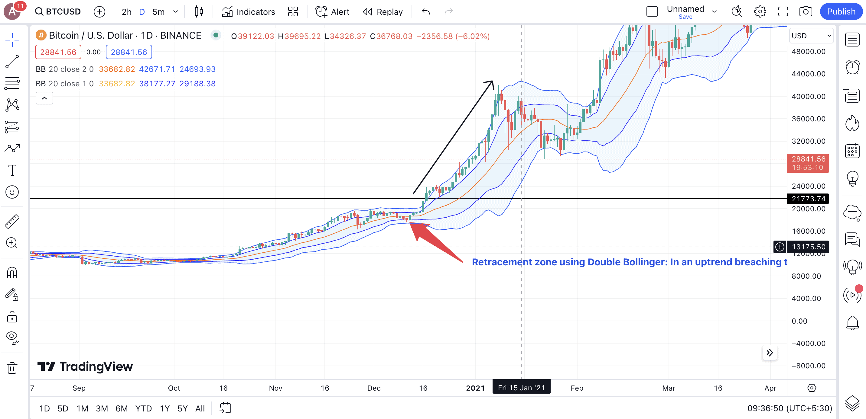 Seasoned traders could have used the Double Bollinger trading strategy to capture BTC’s ascent from $18,000 in December 2020. The best approach would have been to use two Bollinger pairs — the first with one standard deviation as the inner Bollinger and the second with two standard deviations as the outer Bollinger.