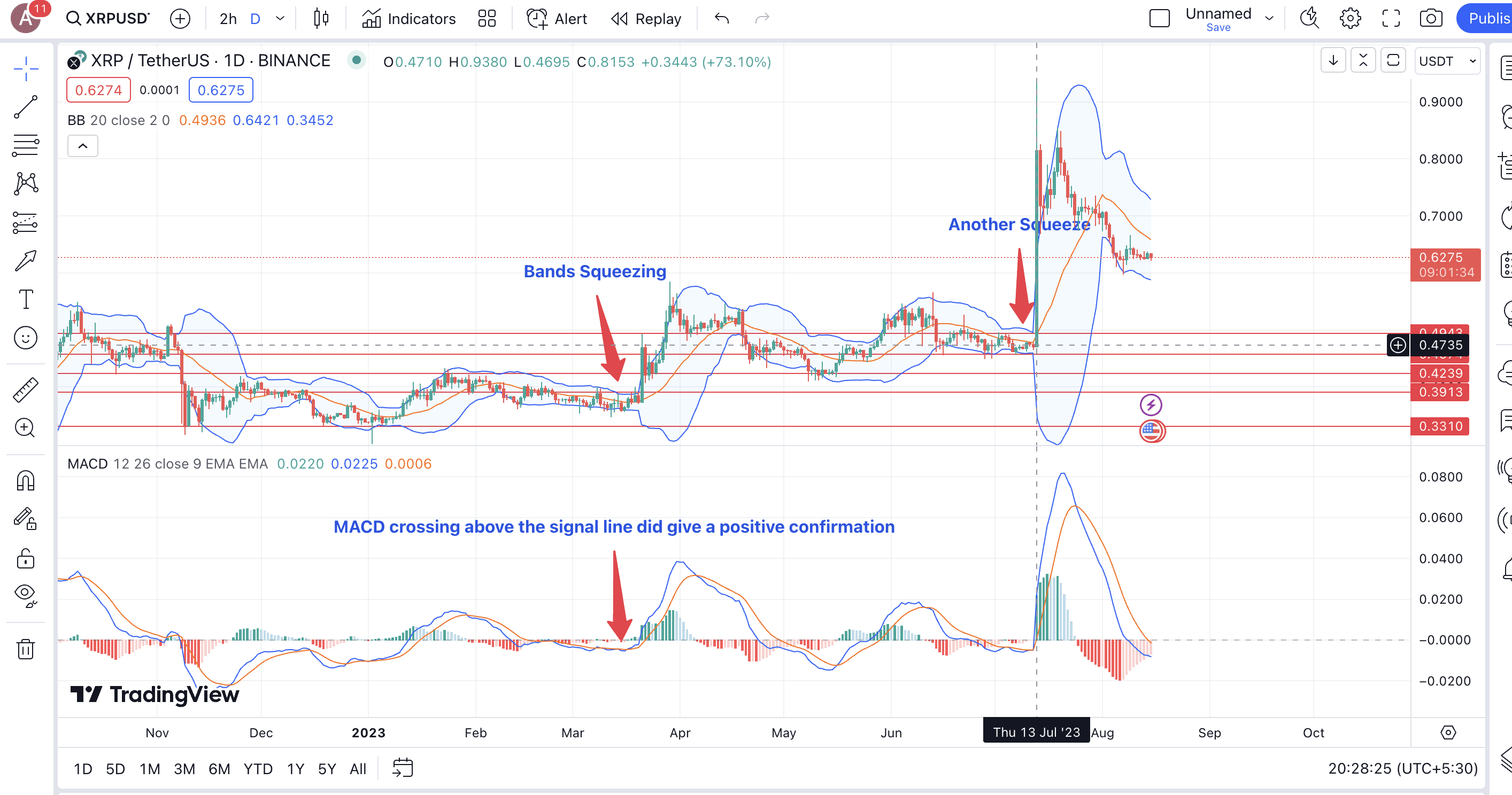 We saw a MACD-led example while exploring XRP’s past price moves. That said, MACD can really help confirm the Bollinger-created signals. The idea is to check for the MACD line crossing the signal line when there is a Bollinger squeeze or when the prices move very close to the lower Bollinger band. This confirms a breakout on the upside or even a short-term surge in prices.