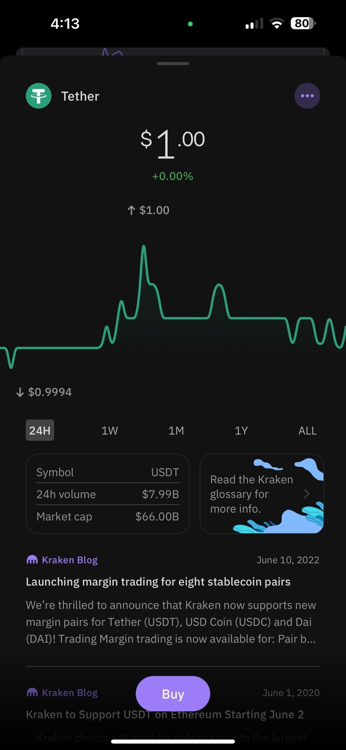 1) First, open up the Kraken app on your iPhone. Select the crypto you want and press the “Buy” button at the bottom of the screen.