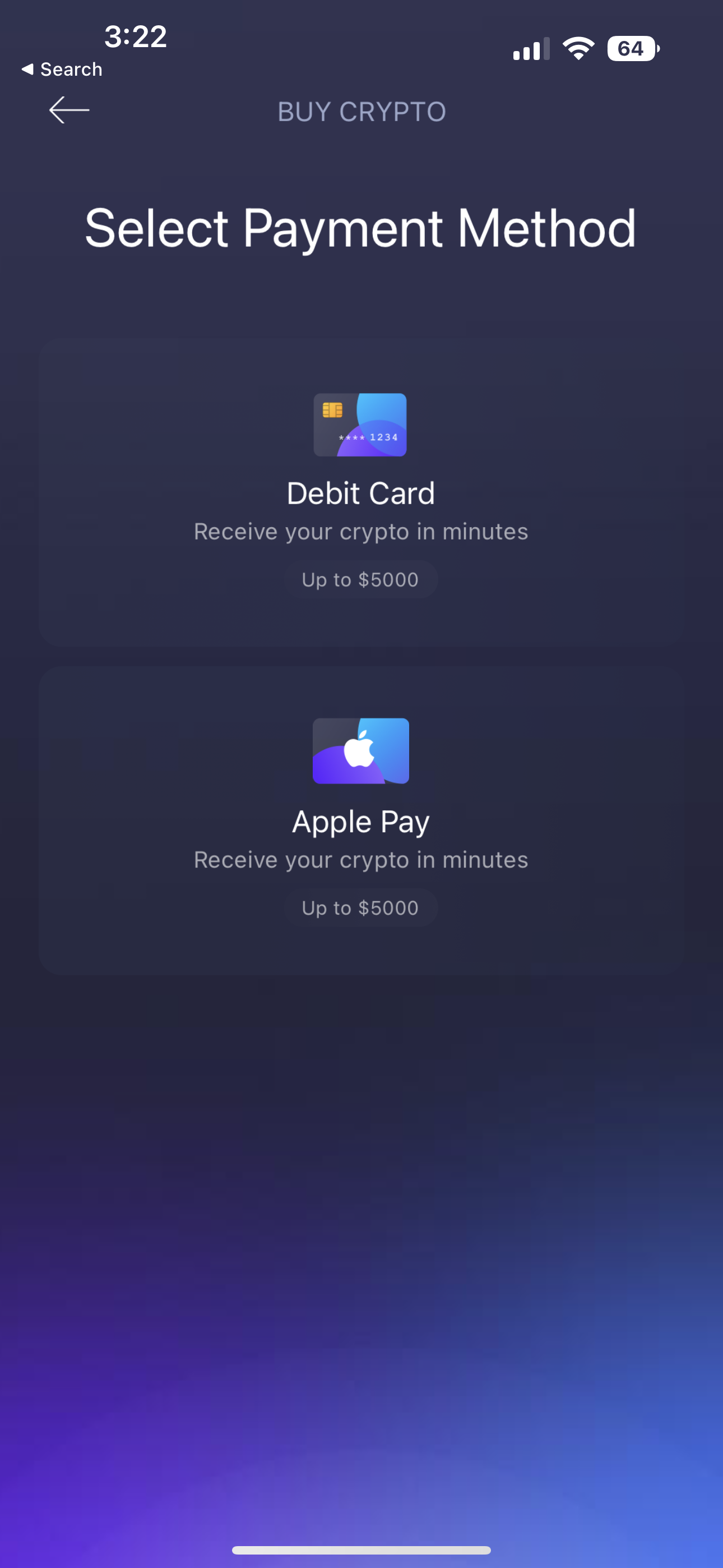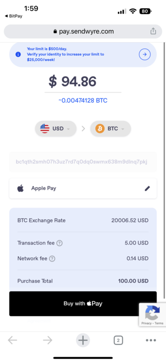| Users can only purchase up to $5,000 in crypto via Apple Pay per transaction/day. |