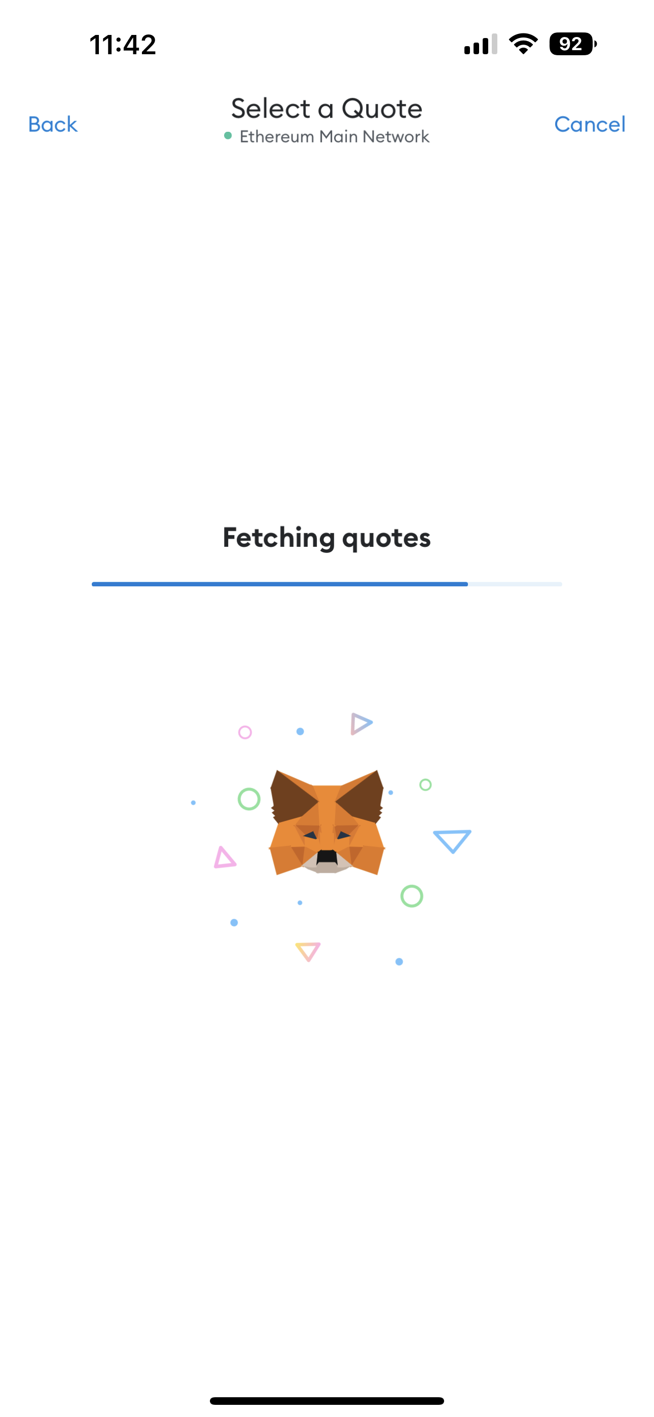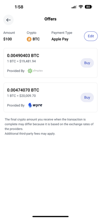 5) You will be presented with a selection of exchange rates and fees from different MetaMask partners. Select your preferred quote from one of MetaMask’s partners. You will be taken to a portal to complete the transaction using Apple Pay.