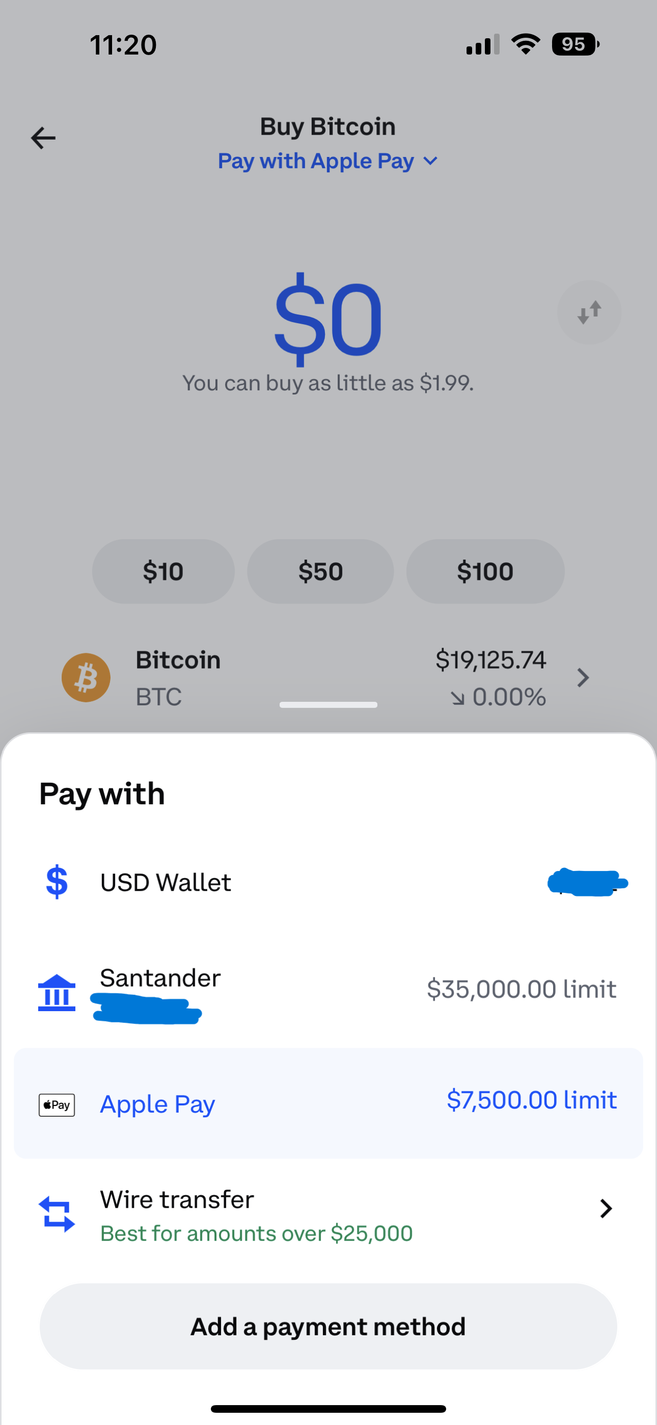 | Convenience: Buying Bitcoin via Coinbase using Apple Pay is ideal for retail investors looking to make small, ad hoc crypto purchases. The platform’s mobile app is one of the most user-friendly on the market. . | Less suitable for large purchases: Crypto purchases using Apple Pay are limited by the daily transaction limit of the associated debit/credit card. Coinbase recommends bank account/wire transfers for those looking to make larger crypto purchases than their daily debit card limit enables. |