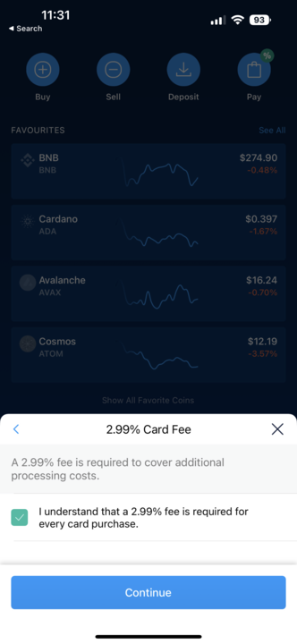 3) You will be prompted to accept Crypto.com’s 2.99% service fee for card purchases. Tick the relevant box and press continue.