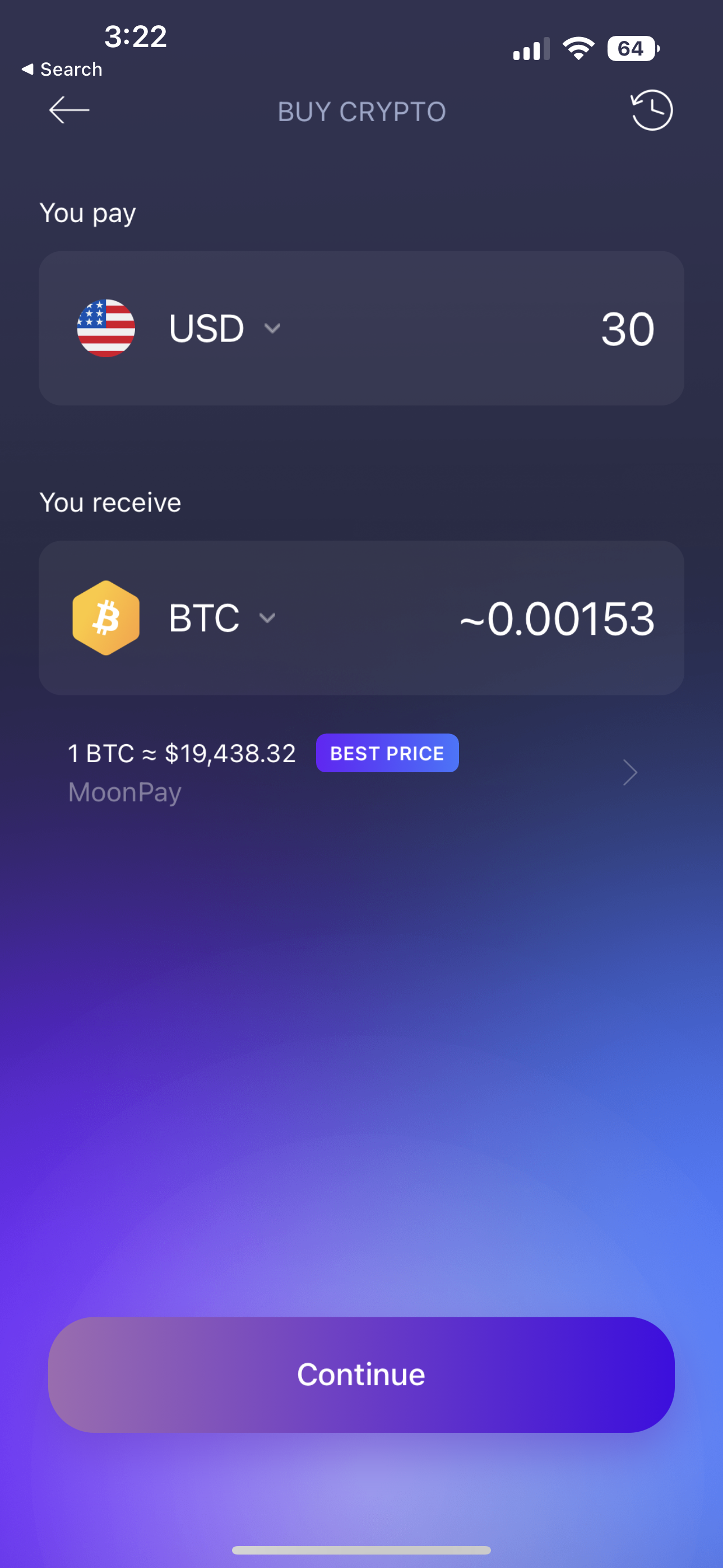 2) Enter the amount of cryptocurrency you want to buy and press “Continue.”